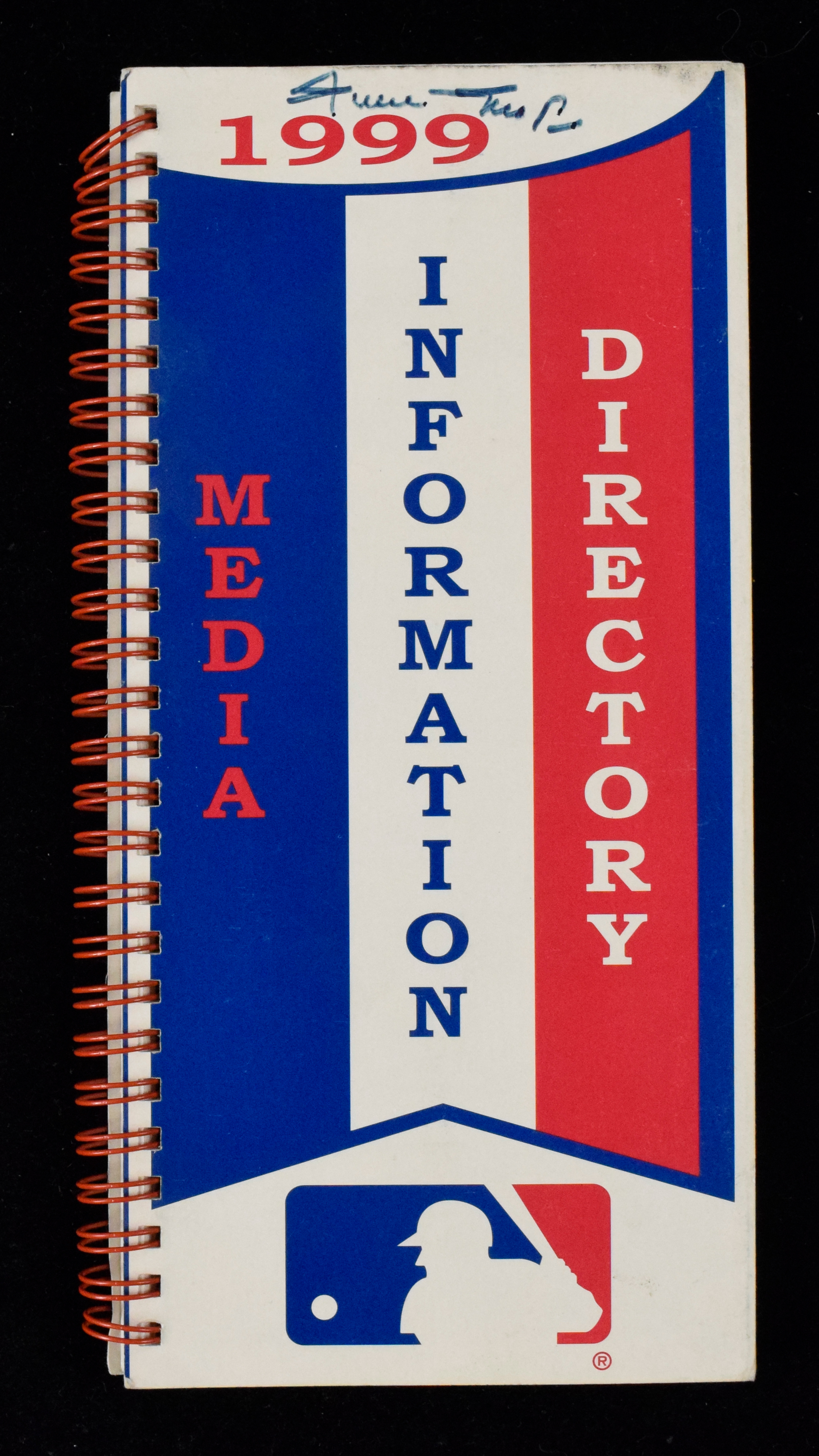 Description:Willie Mays autographed 1999 Major League Baseball media directory (EX) Spiral bound publication issued by Major League Baseball has been signed "Willie Mays" along the top in marker rating 7/8 out of 10. Mild general handling wear. Includes certificate of provenance from the Willie Mays Collection: Overall EX