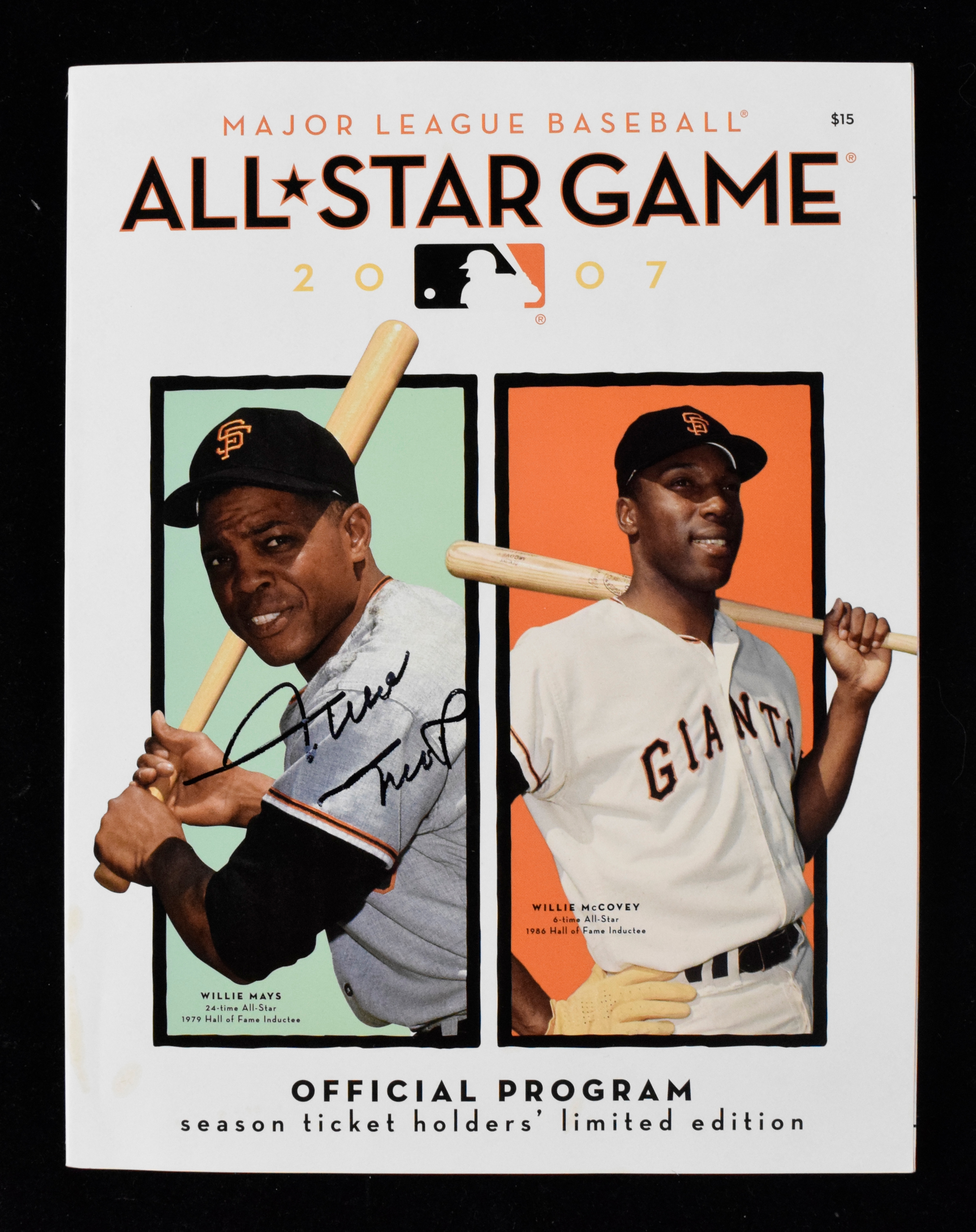 Description:Willie Mays autographed 2007 All-Star Game program (Overall EX) Signed in marker rating approx. 6-6/7 out of 10. Hint of light wear and some very minor discoloration. Includes certificate of provenance from the Willie Mays Collection: Overall EX