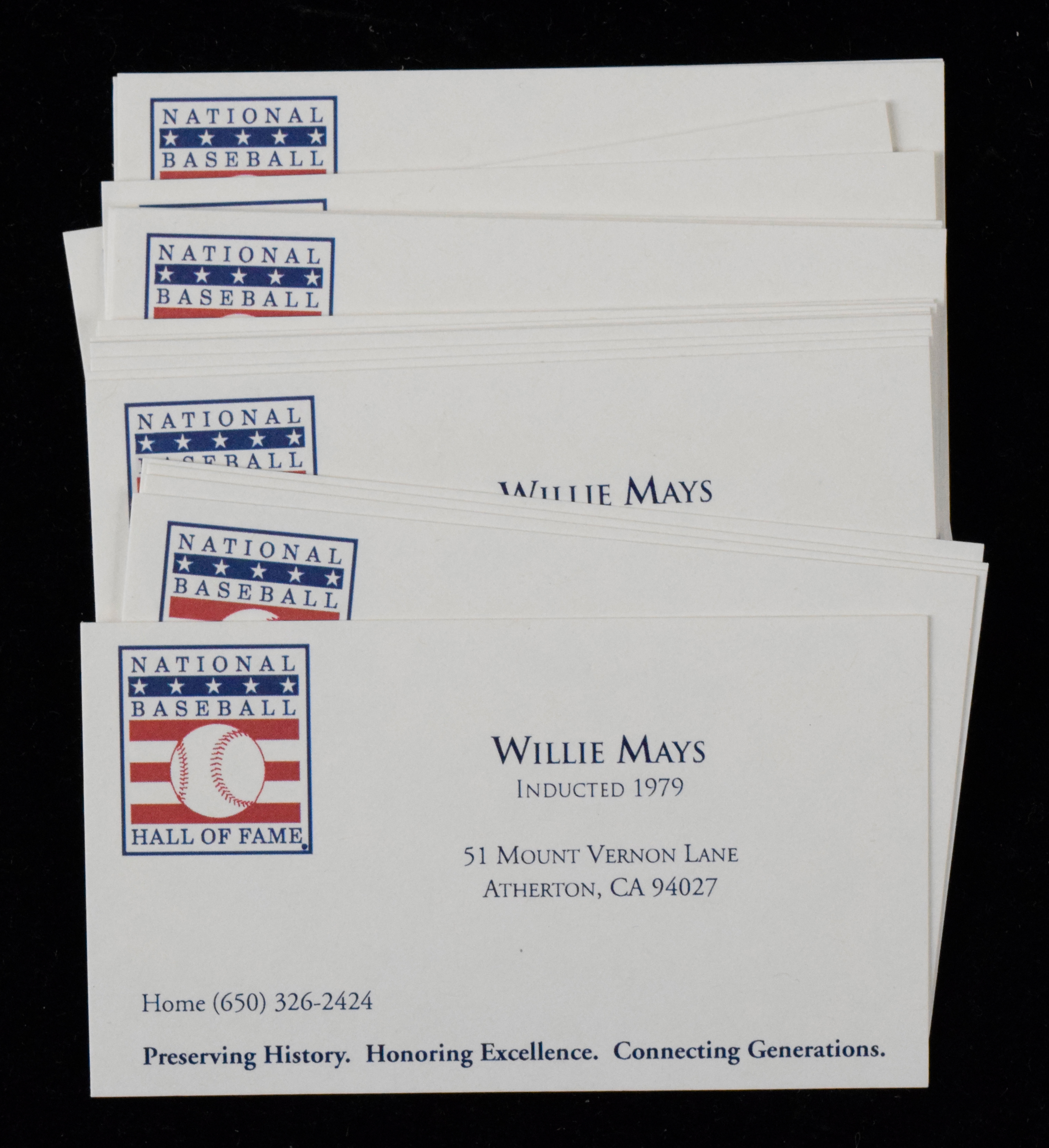 Description:Lot of (25) Willie Mays Hall of Fame logo business cards (EX-NM) Nice lot of Hall of Fame issued business cards which have Mays' name, address, and phone number printed on. Hint of wear to a small portion. Includes certificate of provenance from the Willie Mays Collection: EX-NM