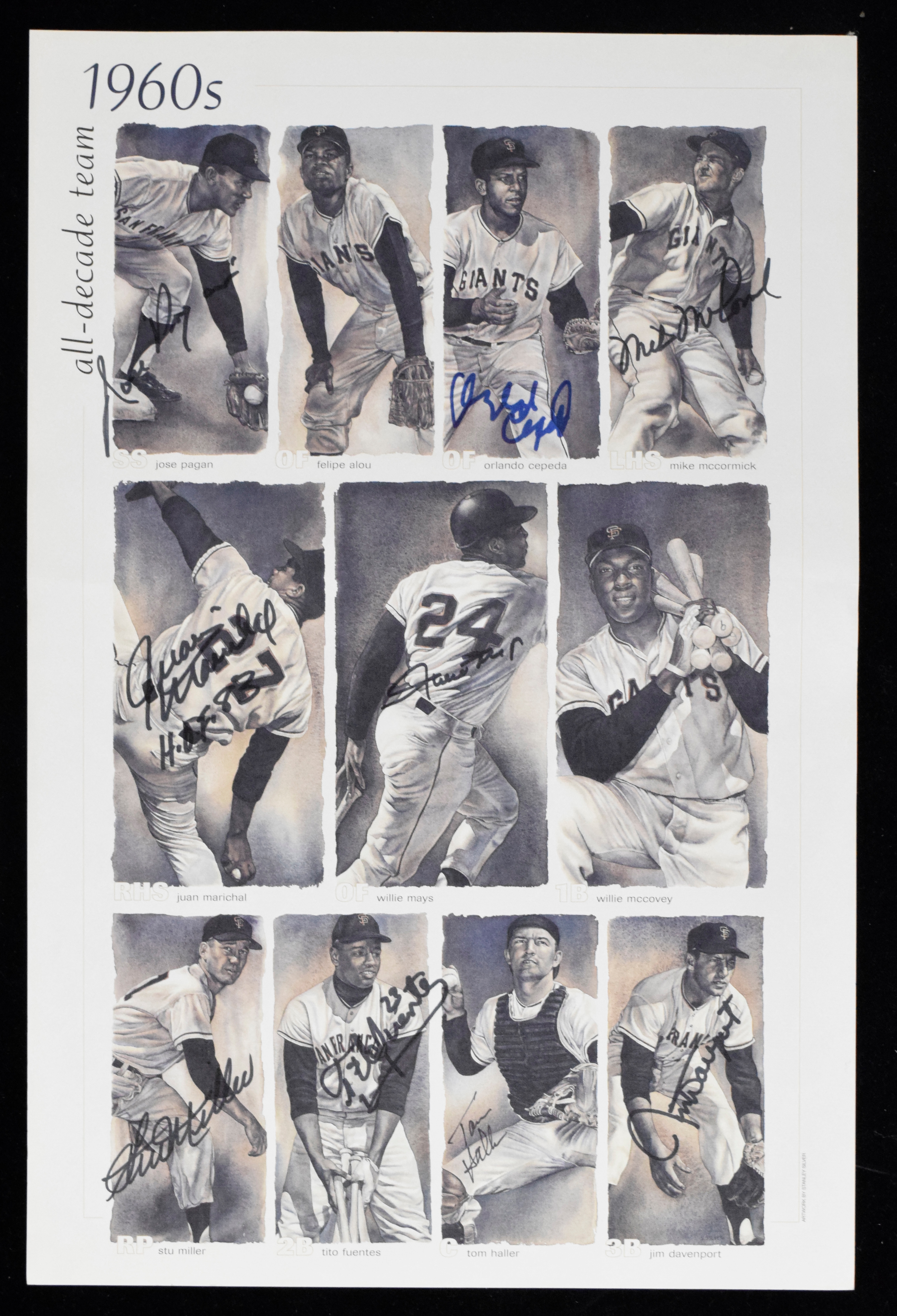 Description:San Francisco Giants 1960s All-Decade Team print signed by (9) incl. Mays (Sigs. NM, Print EX) Nicely done 12.5"x19" print has been signed by Willie Mays, Jose Pagan, Orlando Cepeda, Mike McCormick, Juan Marichal, Stu Miller, Tito Fuentes, Tom Haller, and Jim Davenport. Marker signatures rate 8 out of 10 or better. Light wear would have little effect when framed for display. Includes certificate of provenance from the Willie Mays Collection: Sigs. NM, Print EX