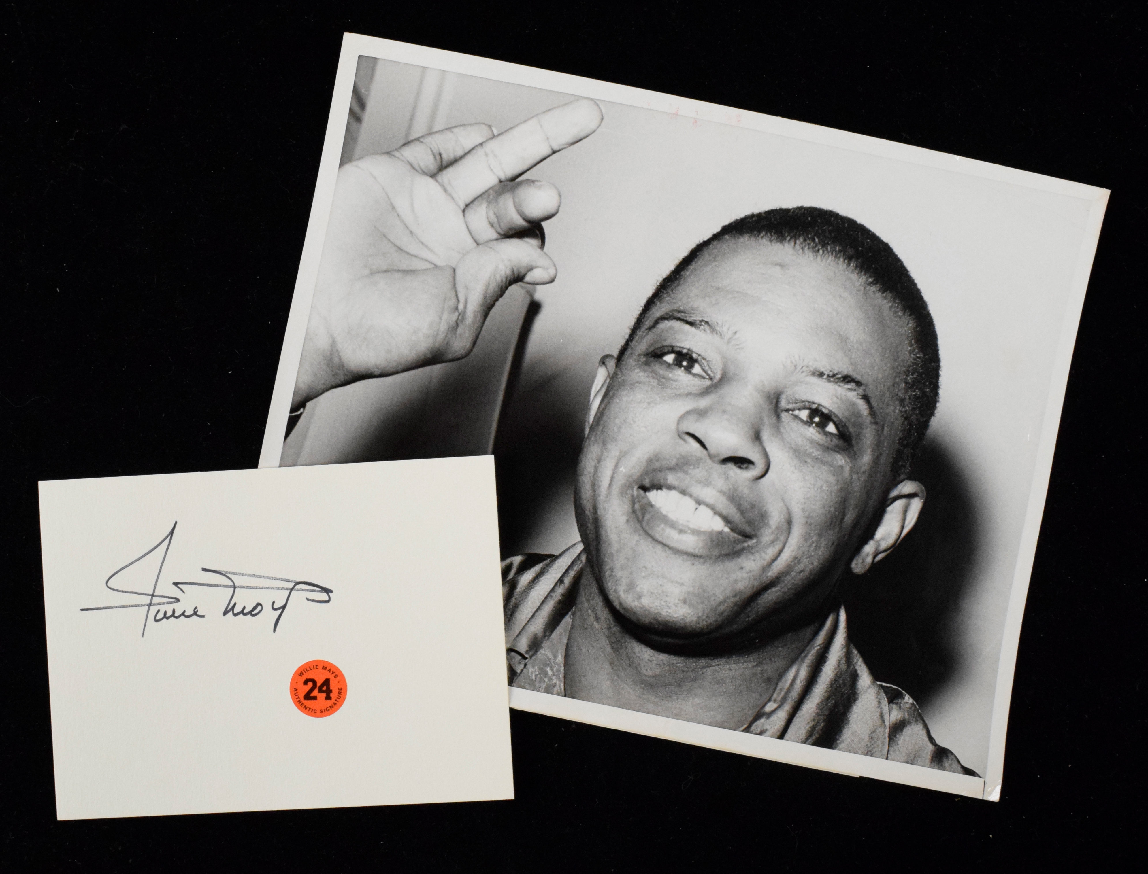 Description:1964 Willie Mays "highest paid" in baseball photo with autograph (VG and NM) Black and white 8"x10" photo has original paper caption (dated 1/15/64) on back which notes that it shows Mays after signing a contract which made him the highest paid player in baseball. There are some additional date stamps and a UPI stamp. Mild handling and storage wear including a few wrinkles/creases; heavy stock 4.5"x6" card signed "Willie Mays" in marker rating 8 out of 10. "Mays Authentic Signature" sticker affixed. Includes certificate of provenance from the Willie Mays Collection: VG and NM