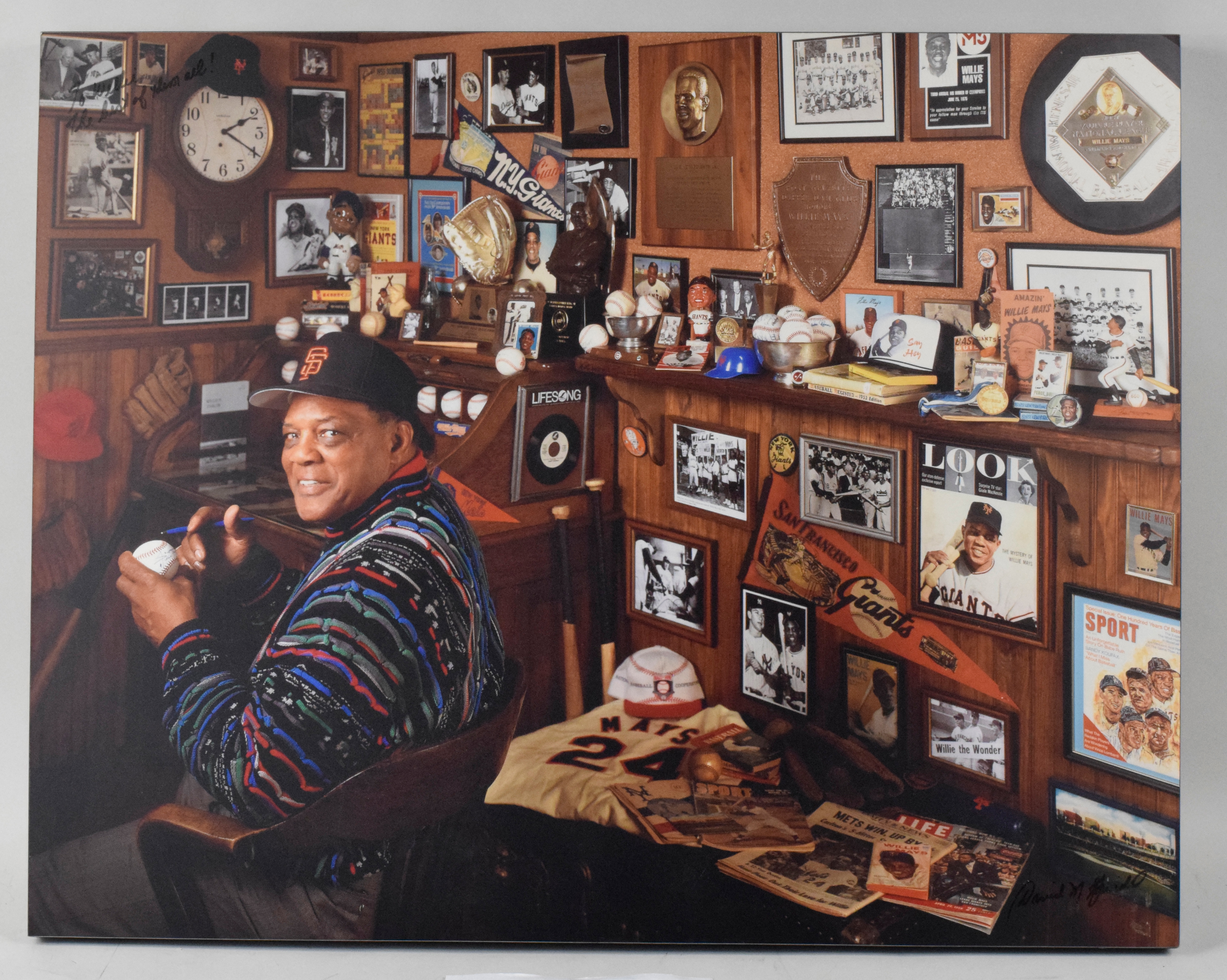 Description:Willie Mays large format presentational photo display signed by David Spindel (EX/MT) Large format photo display measures 30"x37.5" overall with the image mounted to a wooden frame/backing. Signed "To Willie, The best of them all, David Spindel." Spindel is known for his photographs of this type. Some light wear and very minor flaws. Includes certificate of provenance from the Willie Mays Collection: EX/MT