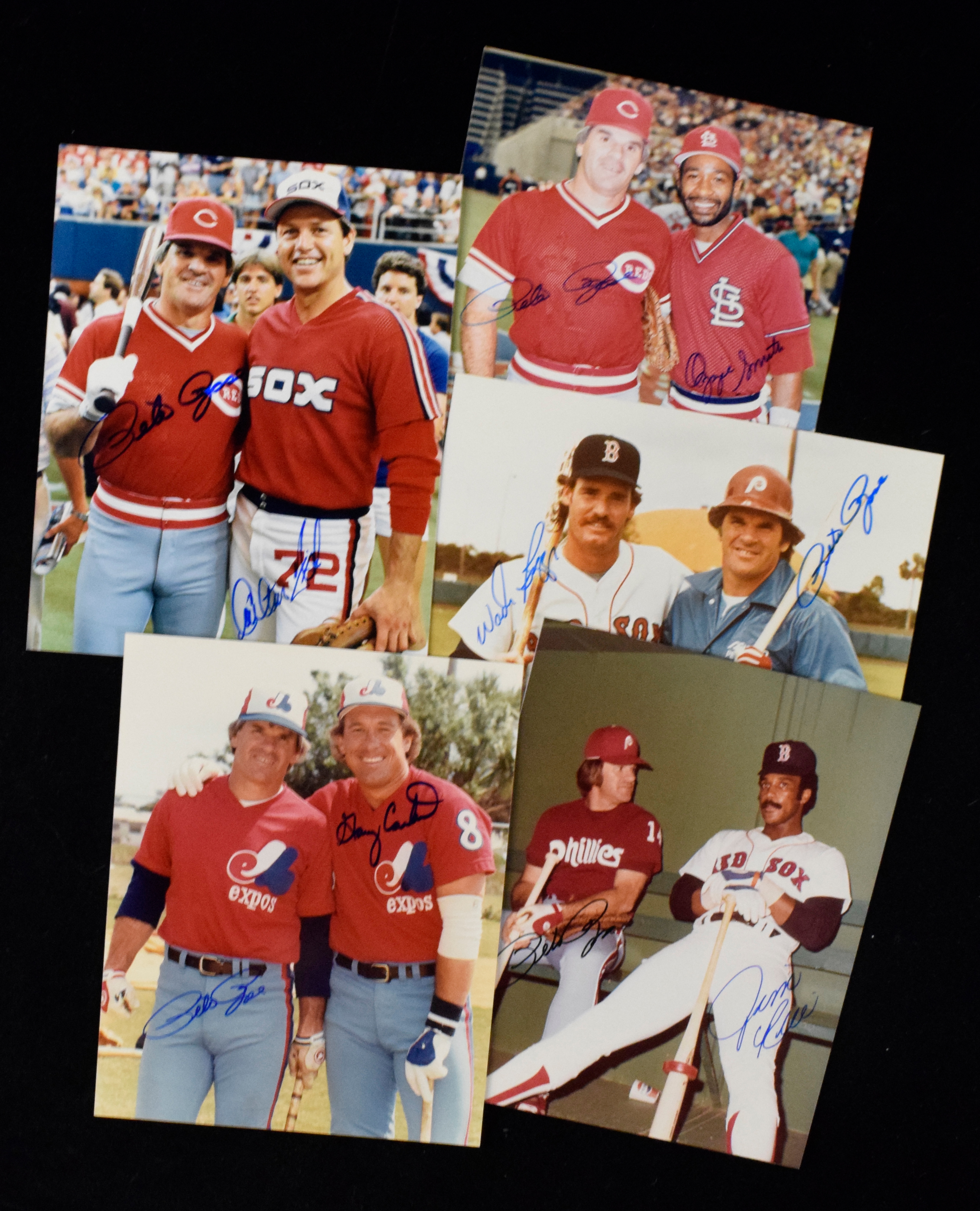 Description:Lot of (5) Pete Rose and Hall of Famer dual signed 8"x10" photos (NM) Nice selection of images, each signed by Pete Rose and a Baseball Hall of Famers. Includes Rose and Gary Carter, Rose and Carlton Fisk, Rose and Ozzie Smith, Rose and Joe Morgan, and Rose and Wade Boggs. Marker signatures rate 8 out of 10 or better: NM
