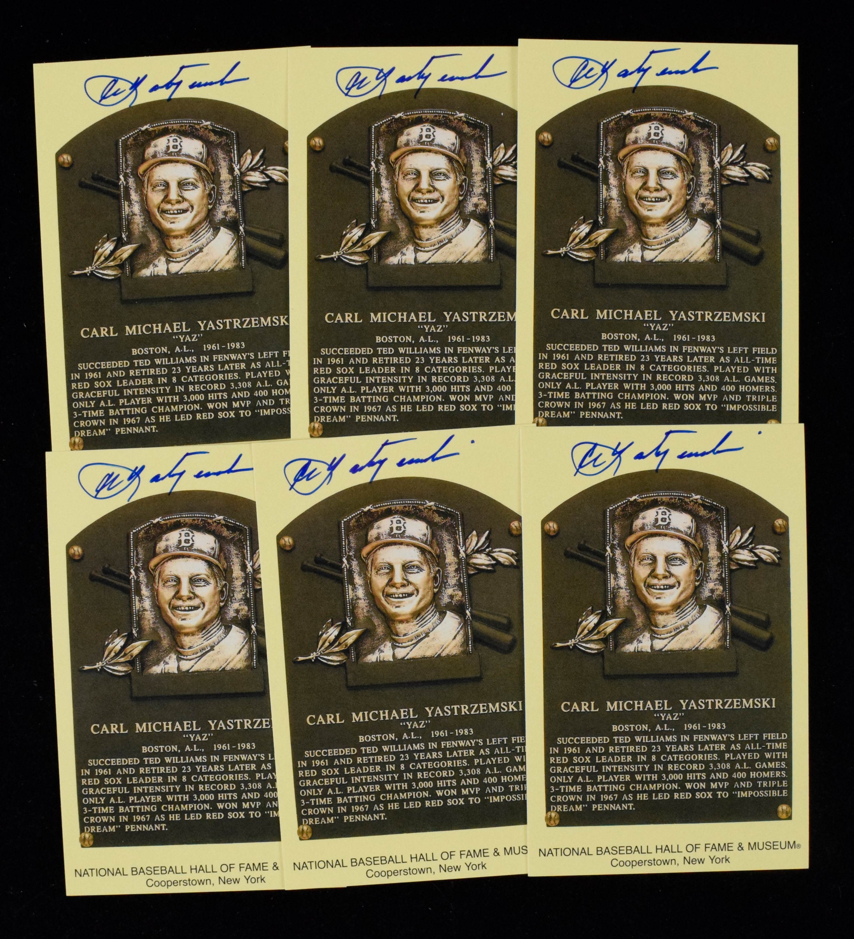 Description:Lot of (6) Carl Yastrzemski autographed yellow Hall of Fame postcards (NM) Each signed in marker rating 8 out of 10 or better: NM
