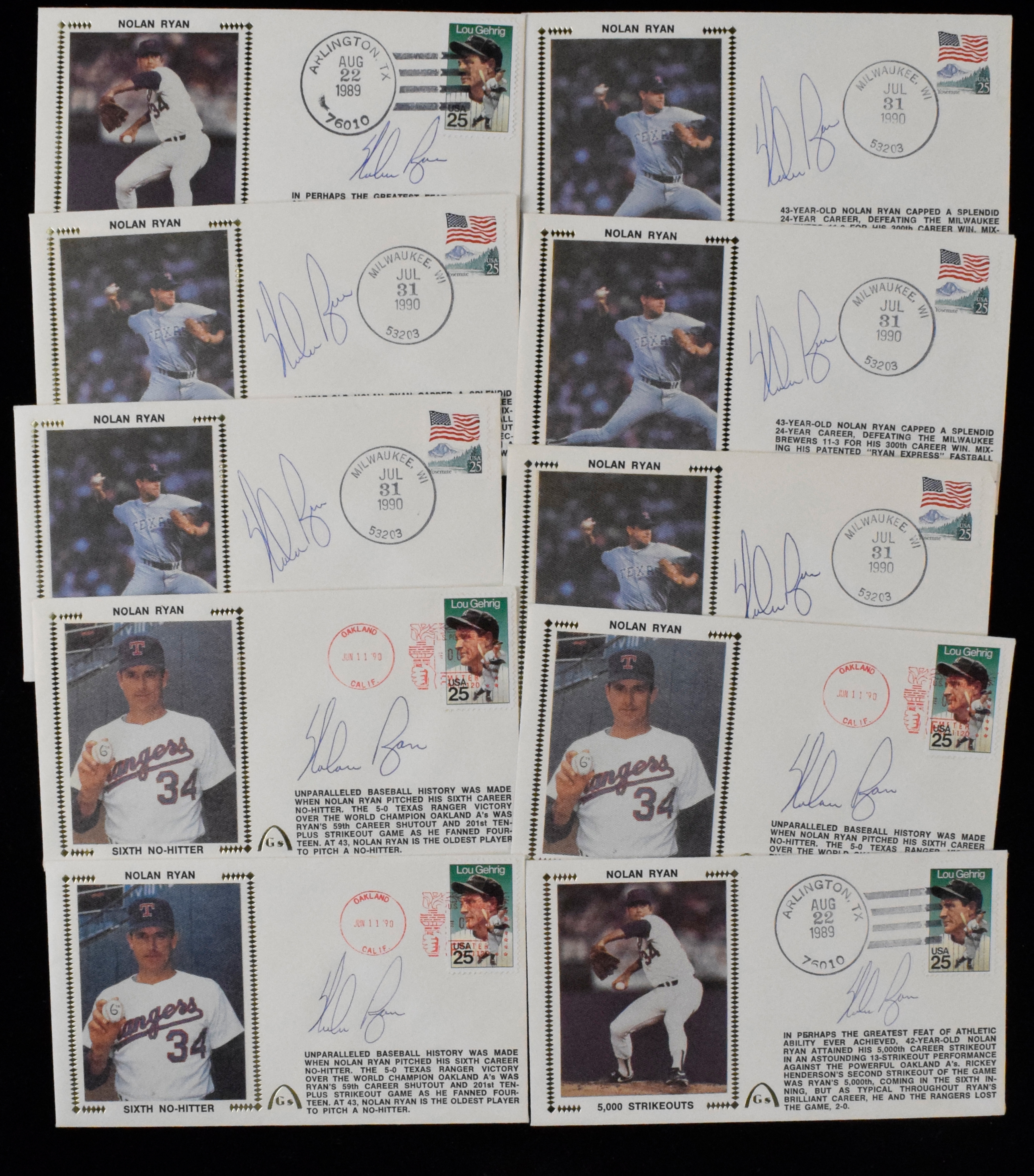Description:Lot of (10) Nolan Ryan autographed Gateway commemorative postal covers (NM) Each signed in ink rating 8 out of 10 or better: NM