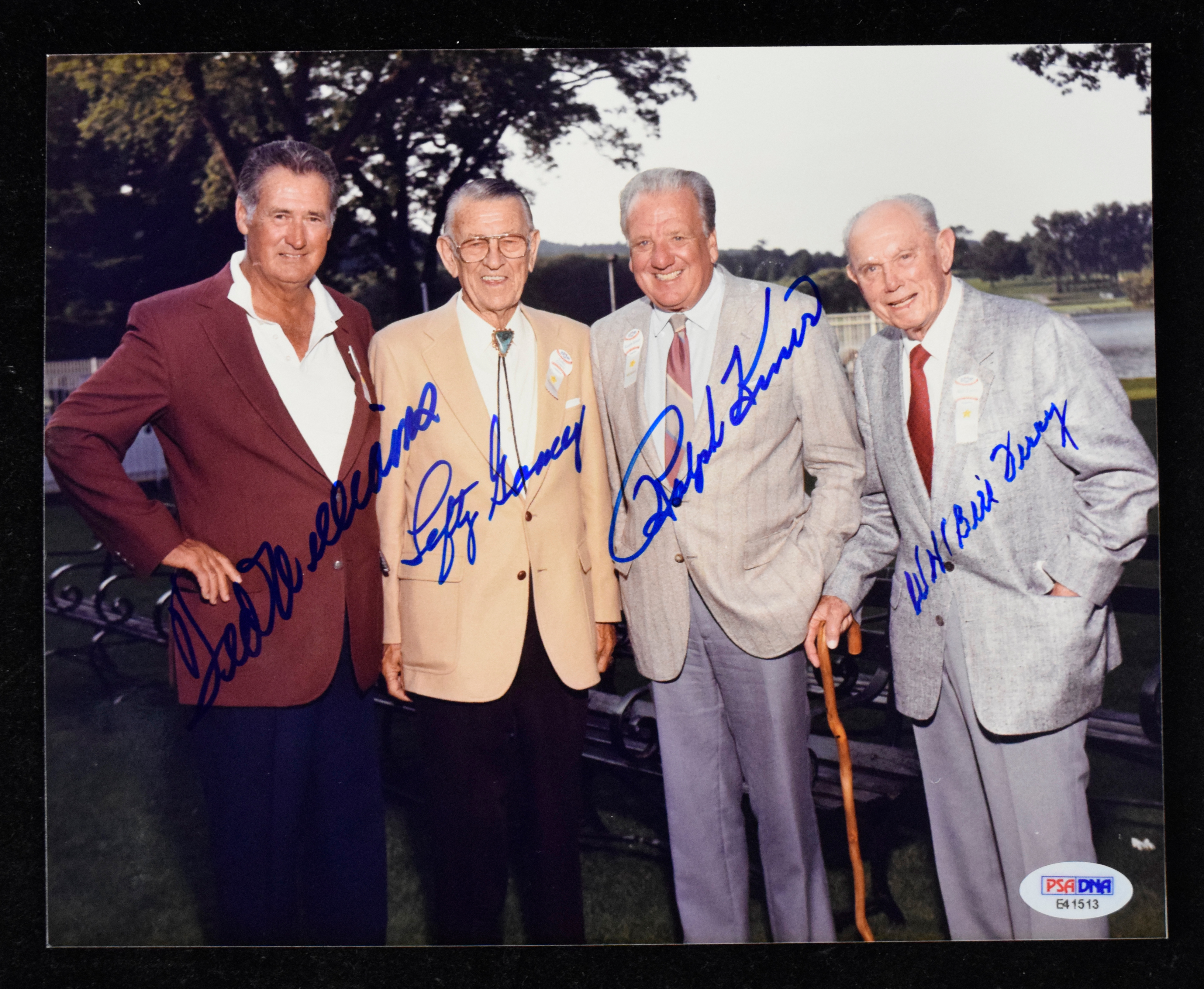 Description:Ted Williams and (3) other Hall of Famer signed 8"x10" photo (PSA/DNA) (NM) Color photo signed by Williams, Lefty Gomez, Ralph Kiner, and Bill Terry. Marker signatures rate 9-9/10 out of 10. Includes full LOA from PSA/DNA: NM