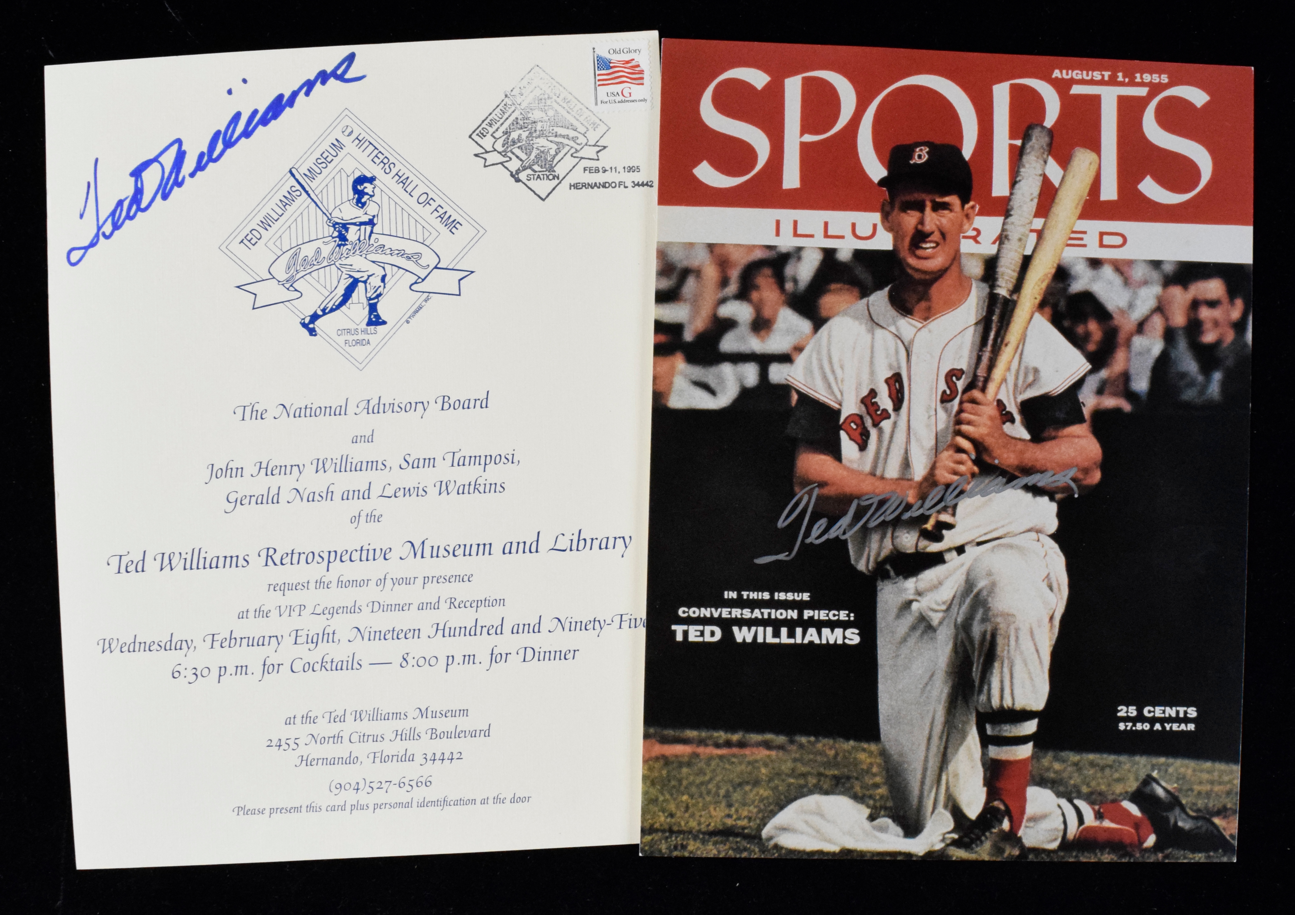 Description:Lot of (2) Ted Williams autographed pieces (NM) Includes color photo/print (just under 8.5"x11") of Sports Illustrated cover and 1995 invitation to the Hitters Hall of Fame Legends Dinner. Each signed in marker rating 8/9 out of 10: NM
