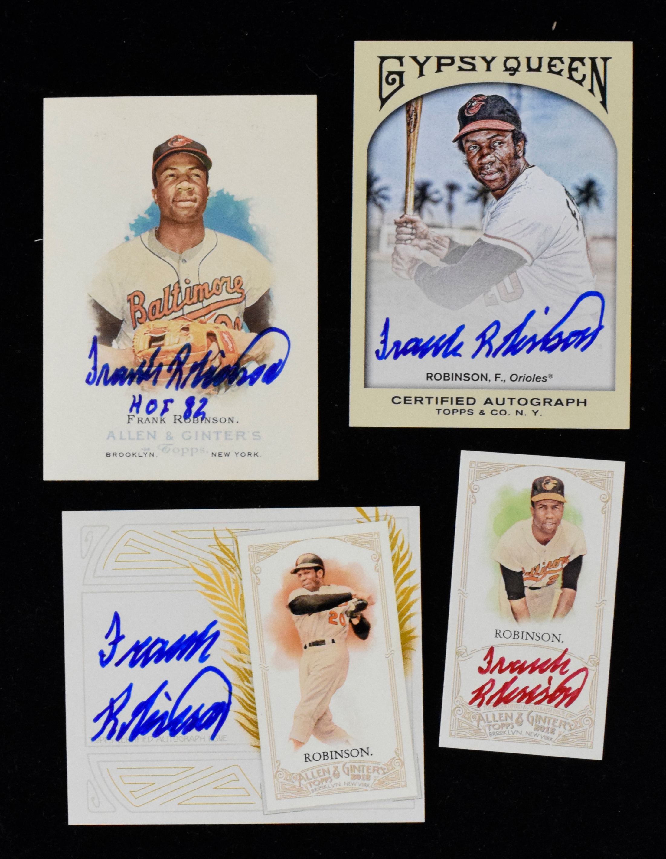 Description:Lot of (10) Frank Robinson autographed pieces incl. Allen & Ginter cards (Sigs. NM - see description) Includes Frank Robinson and Boog Powell signed 8"x10" photo (#500 inscribed); 8"x10" Ron Lewis Living Legend print; 8"x10" Induction Day stat photo; 8"x10" career commemorative photo; meet and greet event handout (back damage); yellow Hall of Fame postcard; and (4) modern trading cards by Topps (3 from Allen & Ginter). PLEASE NOTE - these cards were not pack pulled and may be missing numbering and possibly a Topps hologram: Sigs. NM
