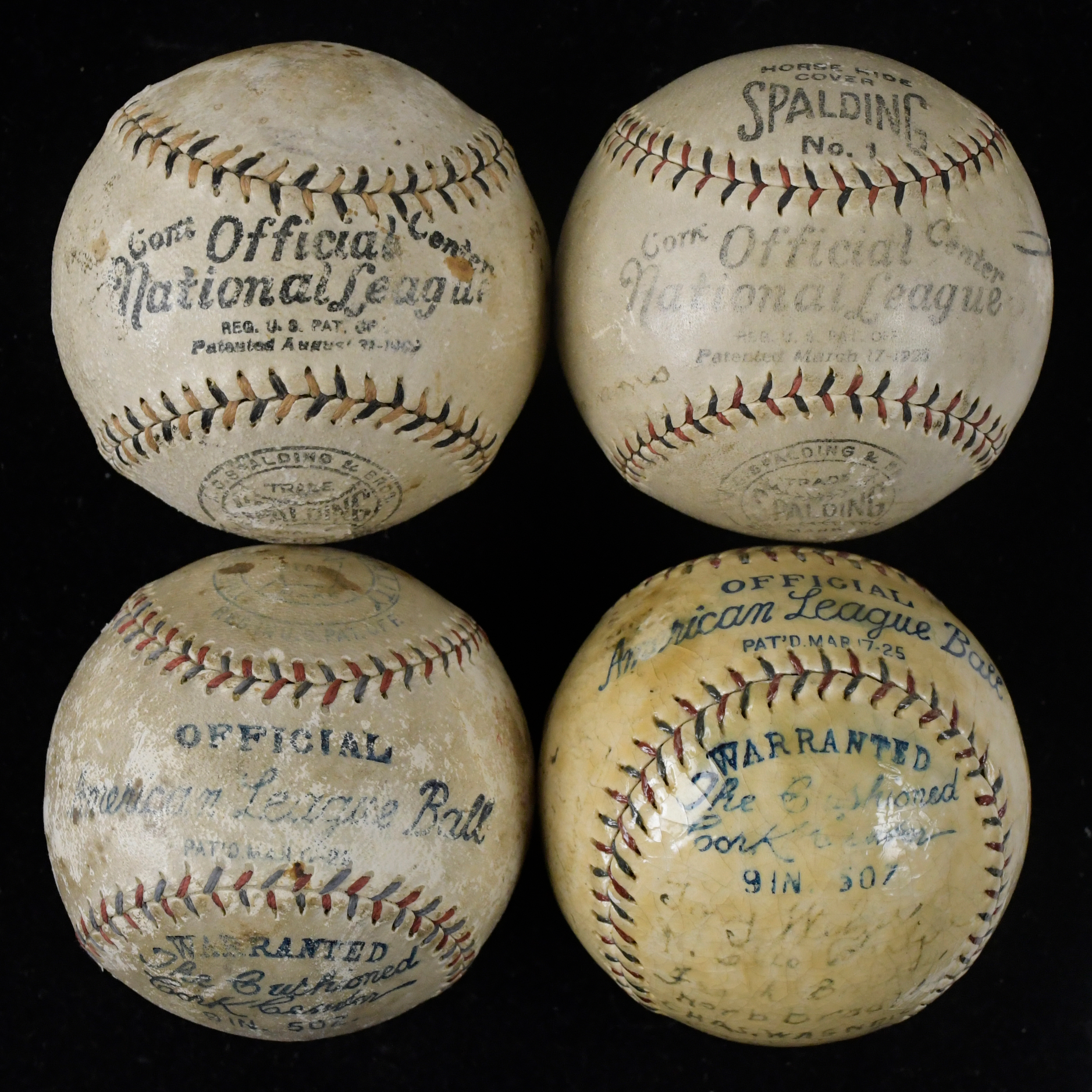 Description:Lot of (4) official National League & American League baseballs, c.1919-1927 (GD-VG/EX see description). Includes c.1919-24 Spalding official NL baseball (GD); c.1925 Spalding official NL baseball (VG/EX has an authentic Fred Fitzsimmons autograph along with some non-authentic signatures); c.1926-27 Reach official AL baseball (GD-G/VG); and Reach official AL ball signed by approx. (20) members of the 1927 Bostion Red Sox: Charles (Heinie) Wagner, Jack Russell, Buddy Myer, Slim Harriss, Billy Rogell, Tony Welzer, Herb Bradley, Phil J. Todt, Walter Shaner, Del Lundgren, and others (most too faded to decipher). Signatures average 3/4 out of 10 (VG/EX shellacked). ($400-$600)