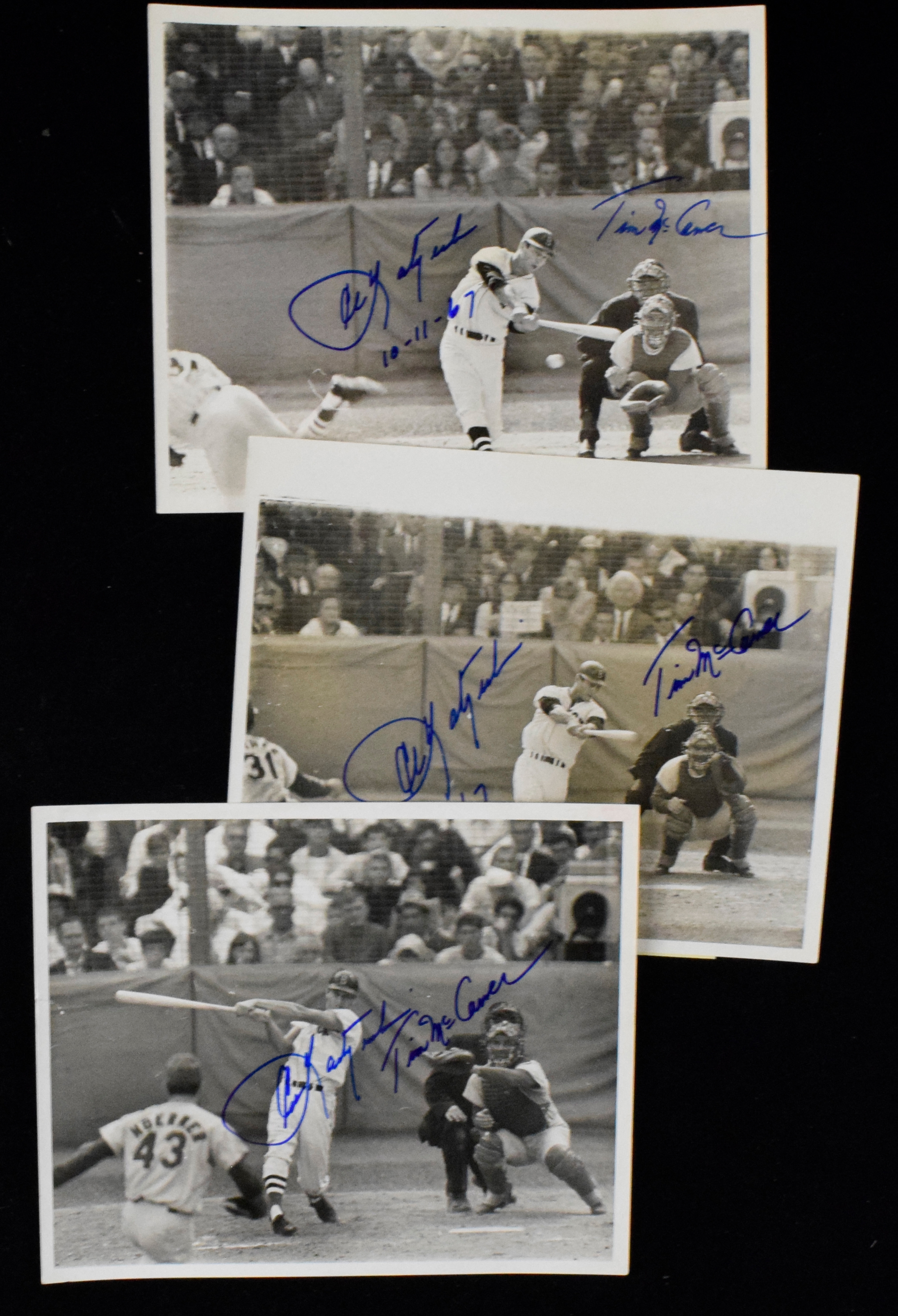Description:Lot of (3) Carl Yastrzemski and Tim McCarver signed vintage 1967 World Series press photos (Sigs. NM, Photos EX) Trio of 8"x10" photographs which are original to the period and show Yaz at bat in the 1967 World Series. Each has a United Press stamp on the back and (2) have original paper captions affixed. All are signed by both Carl Yastrzemski and Tim McCarver in marker rating 9 out of 10 or better. Photos have some mild toning and storage wear: Sigs. NM, Photos EX