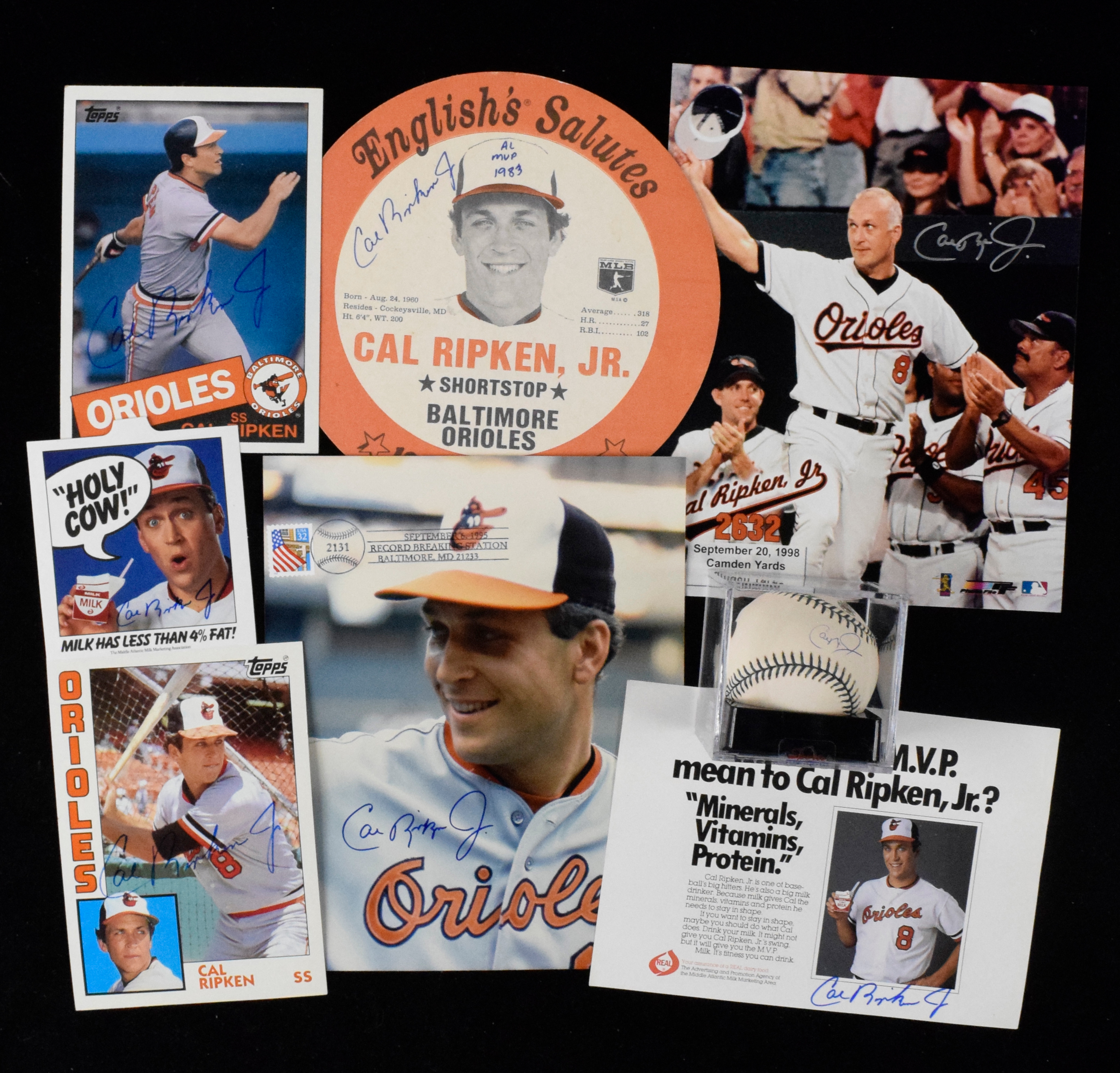 Description:Nice lot of (8) Cal Ripken Jr autographed pieces (EX-NM) Includes Rawlings Official 2001 All-Star Game logo baseball which is sealed in a cube that has PSA grading label (Mint 9) on the underside; English's Salutes heavy stock promotional disc (8.5" across) signed "Cal Ripken Jr AL MVP 1983" in the period; 8"x10" photo with "2131" postmark and another commemorating his streak; 1984 and 1985 Topps Jumbo cards; (2) pieces related to his promotion of milk. Marker signatures rate 8 out of 10 or better: EX-NM