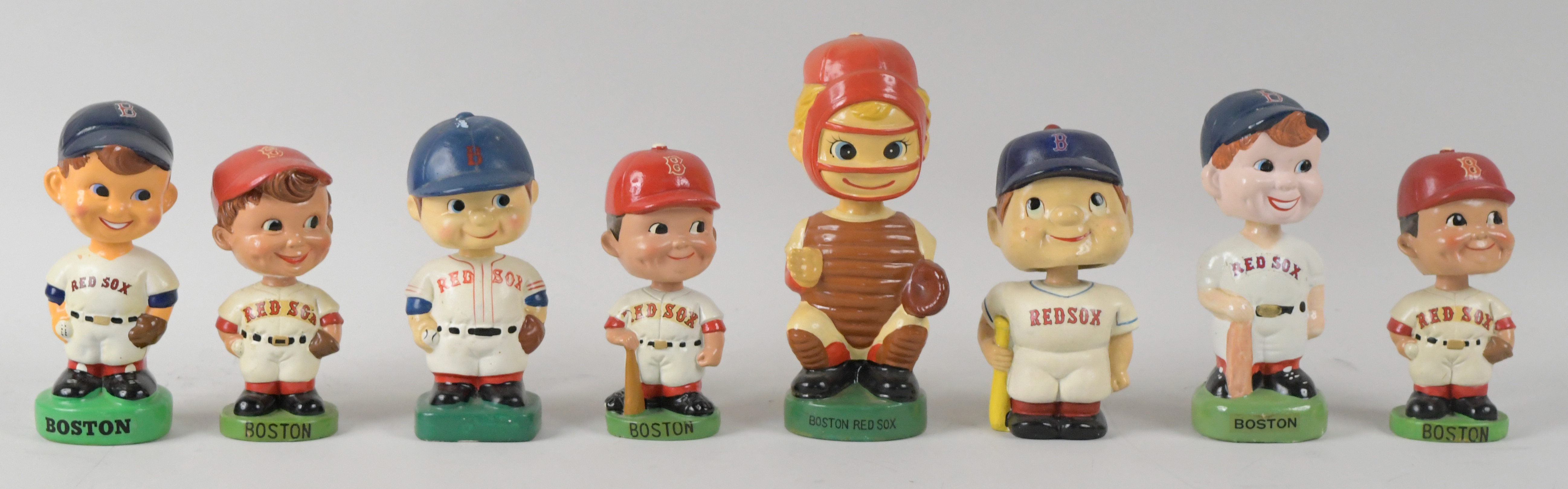 Description:Lot of (8) different Boston Red Sox nodders (VG-EX/MT). Includes c.early 1960s 7" square green base Red Sox nodder bank (VG-VG/EX), 1962 6.5" round green base Red Sox nodder variation holding baseball and wearing red hat without hair under brim (VG/EX-EX), c.1963-65 6.5" round green base Red Sox nodder variation holding bat and wearing red hat without hair under brim (EX), c.1963-65 6.5" round green base Red Sox nodder variation holding baseball and wearing red hat with hair under brim (VG/EX-EX), c.1960s 7" Red Sox nodder bank on feet without base (EX/MT), c.1960s-70s 9" Red Sox nodder bank (EX-EX/MT), c.1980s 7.5" green base Red Sox nodder (EX/MT), and c.1980s-90s 7.5" green base Red Sox nodder (EX/MT). ($400-$600)