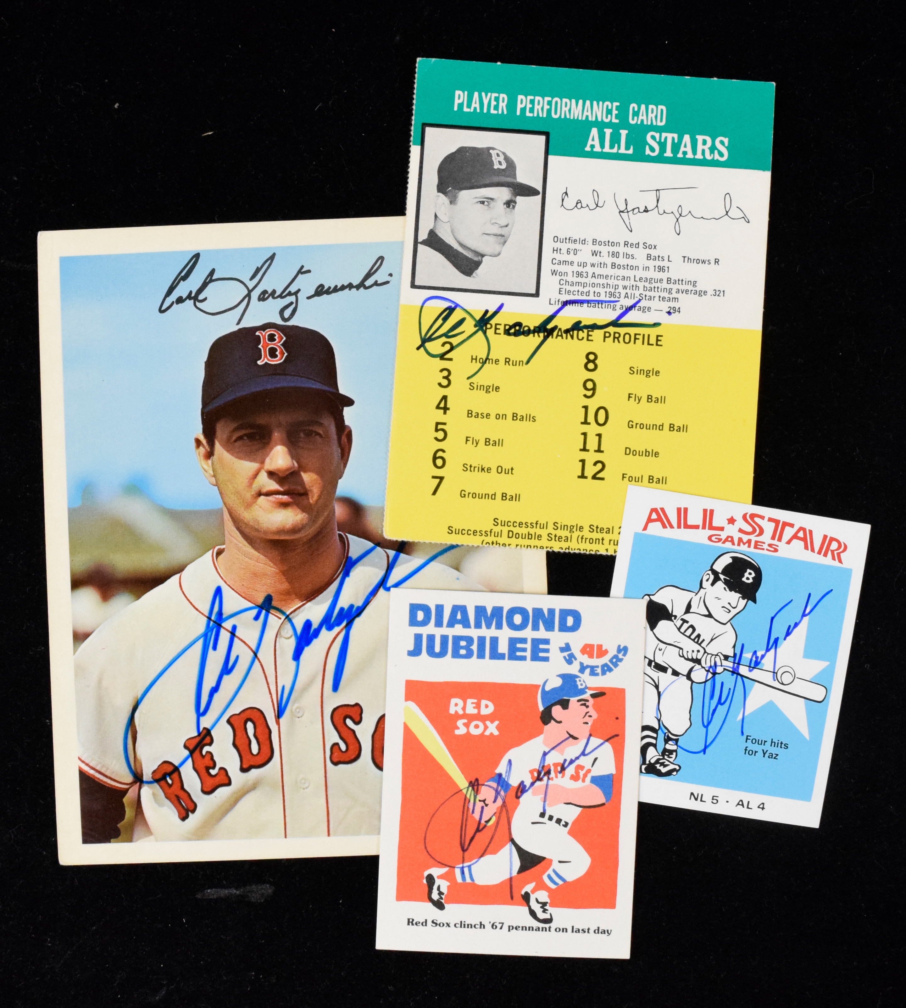 Description:Lot of (4) 1964-1976 Carl Yastrzemski autographed oddball cards/pieces (Sigs. EX/MT-NM) Includes 1964 Challenge The Yankees card (VG); 1967 Dexter Press premium (VG); 1974 Laughlin All Star Game card (EX); and 1976 Laughlin Diamond Jubilee card (EX/MT). Marker signatures rate 7/8 out of 10 or better: Sigs. EX/MT-NM
