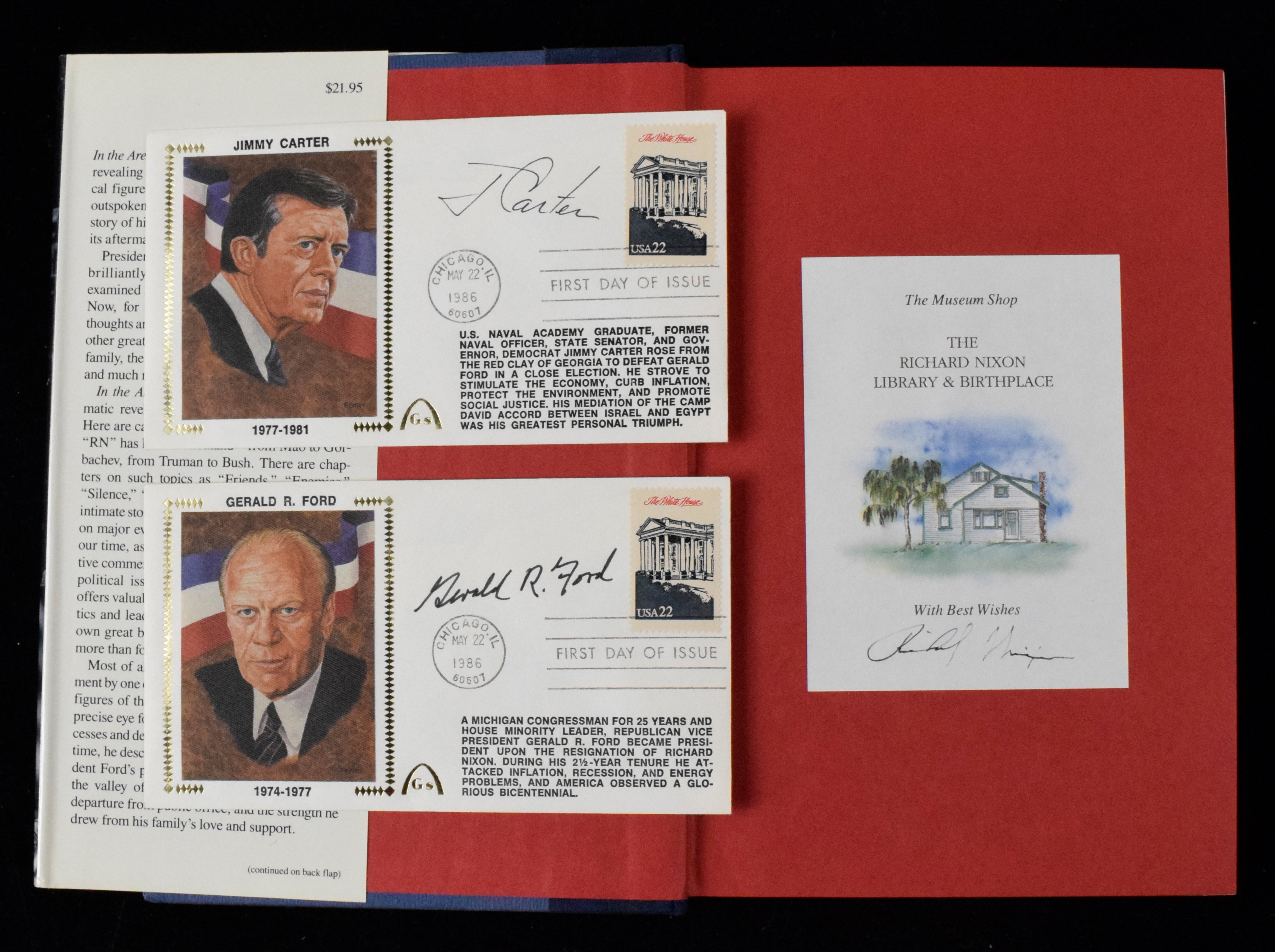 Description:Richard Nixon, Gerald Ford, and Jimmy Carter autographs (EX-NM) Includes hardcover copy of "In The Arena" which has a Richard Nixon autographed bookplate affixed to first inside page; Gerald Ford and Jimmy Carter autographed Gateway commemorative postal covers. Signatures rate 8 out of 10 or better. Also includes other Presidential covers (covering a number of Presidents) which are not signed: EX-NM
