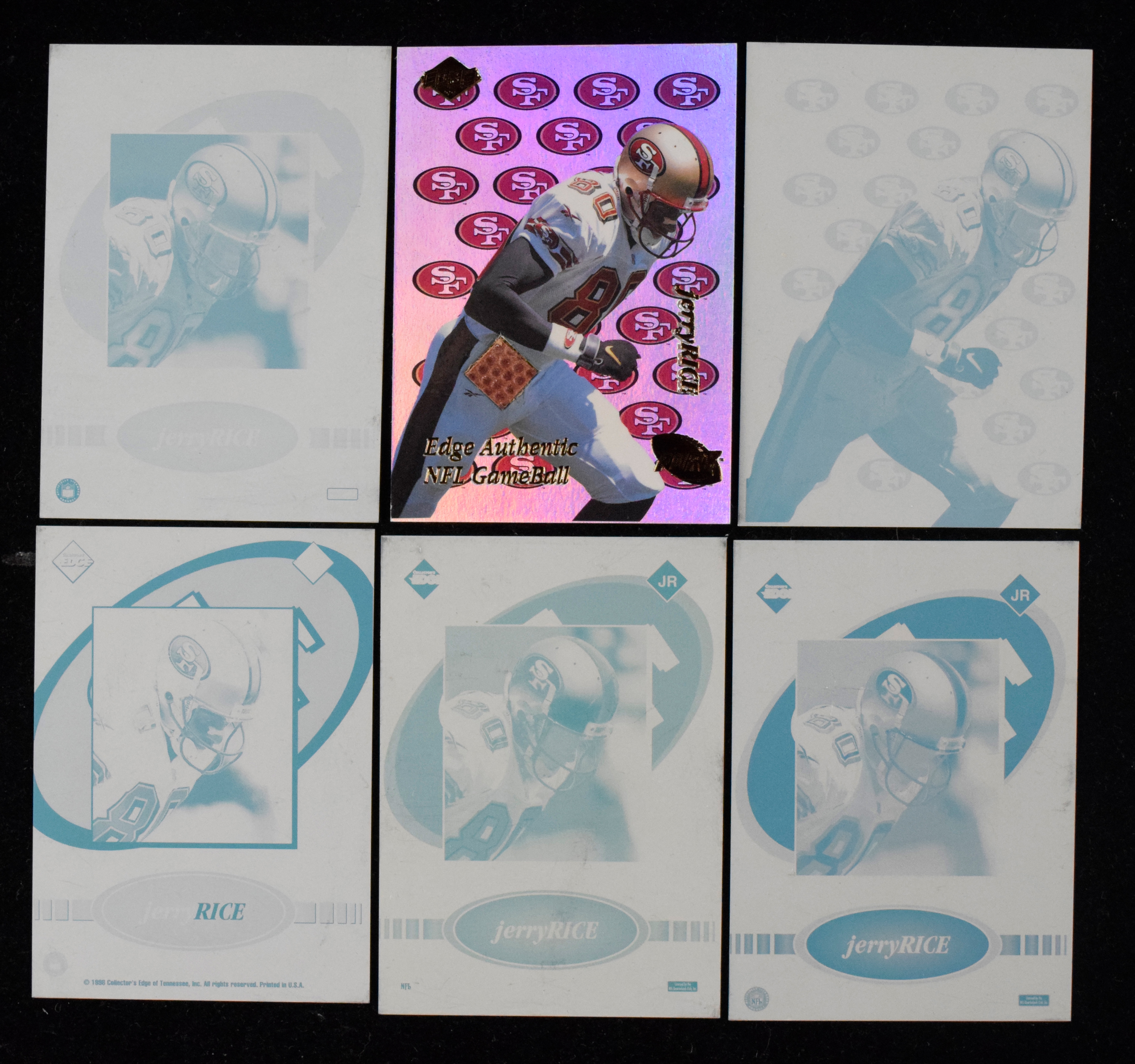 Description:1999 Collector's Edge Fury Jerry Rice game ball card with (8) related printing plates (VG-EX/MT) Includes card which has a small piece of inset game ball; total of (8) printing plates which presumably relate to the production of the card. There are (4) for the front and (4) for the back, each of which have some subtle differences. Touch of light scattered wear is more pronounced on some plates: VG-EX/MT