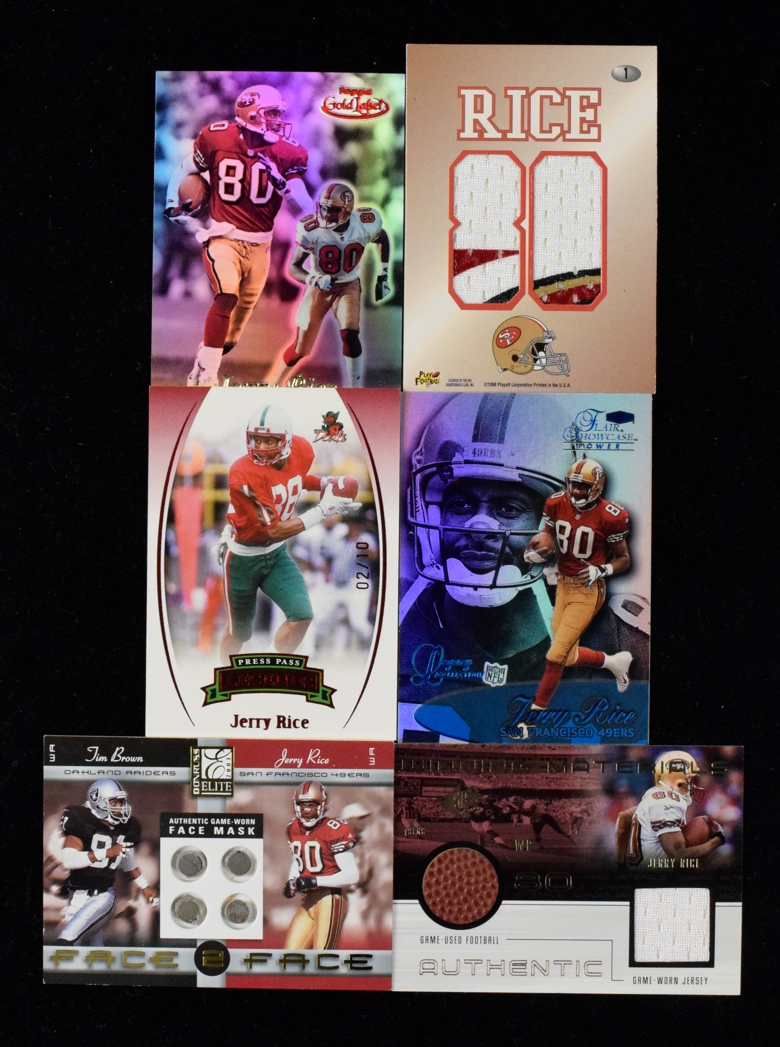 Description:Nice lot of (8) 1991-2007 Jerry Rice insert, patch, parallel cards (EX-NM) Includes 1991 Pacific printing plate representing the back of Rice's card #467; 1999 Fleer Flair Showcase Legacy Collection Row 1 (12/99); 1999 Playoff Momentum Team Threads patch; 1999 SPx Winning Materials dual patch; 1999 Topps Gold Label Red #60 (37/50); 2001 Donruss Elite Face 2 Face Jerry Rice and Tim Brown with pieces of facemasks (23/50); 2002 Donruss Jersey Kings patch (11/25); 2007 Press Pass Legends #79 (2/10). Touch of light wear to a few: EX-NM