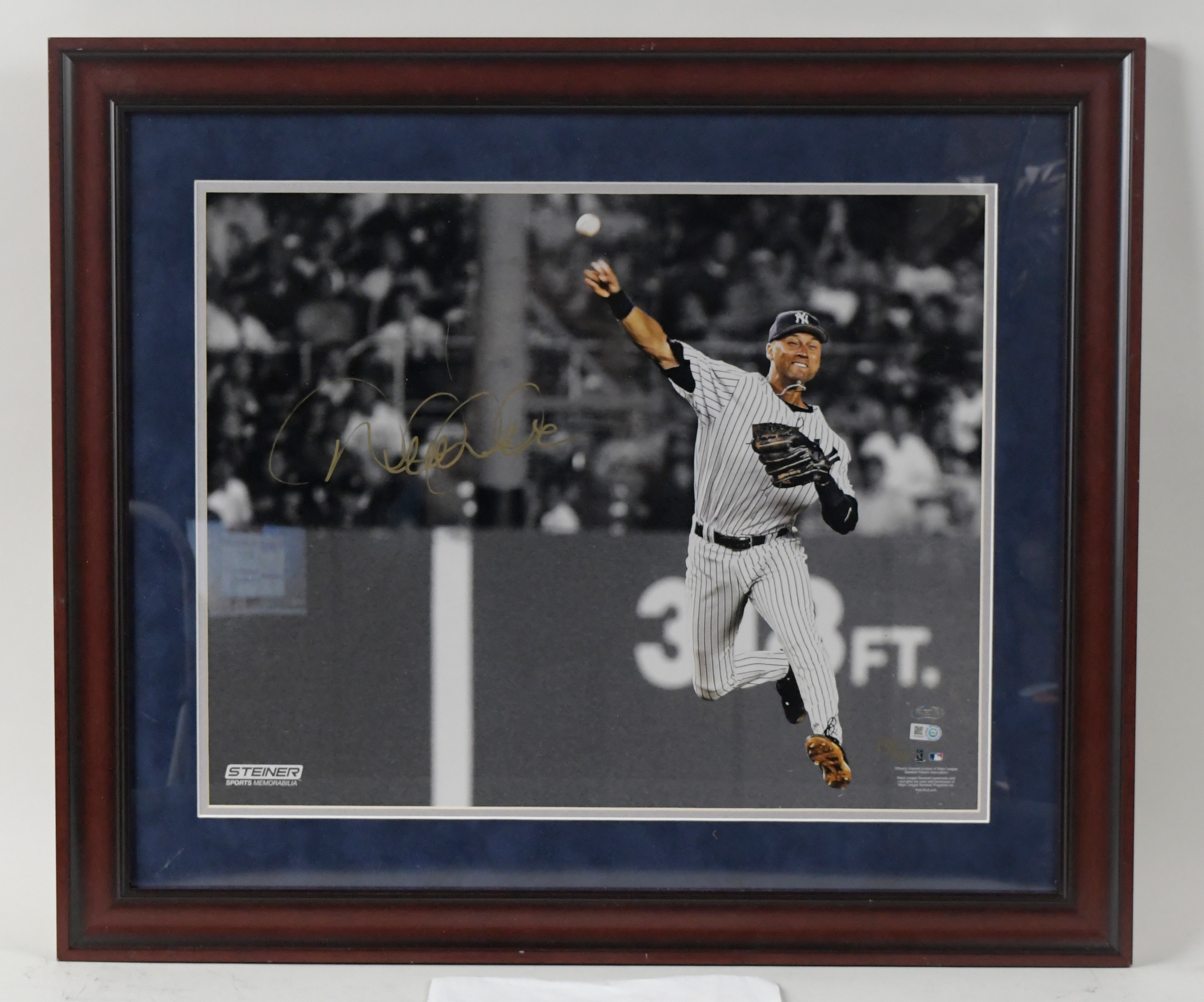 Description:Derek Jeter autographed limited edition oversize framed photo - Steiner & MLB Authenticated (NM). Frame measures approx. 23.5"x27" (photo is a 16"x20"). Jeter signed the photo in gold marker. Signature rates 8/9 out of 10. Includes COA from Steiner (MLB Authenticated and Steiner hologram stickers are on the photo). Numbered 20/50. Due to framing, complete condition is unknown: NM appearance ($400-$600)
