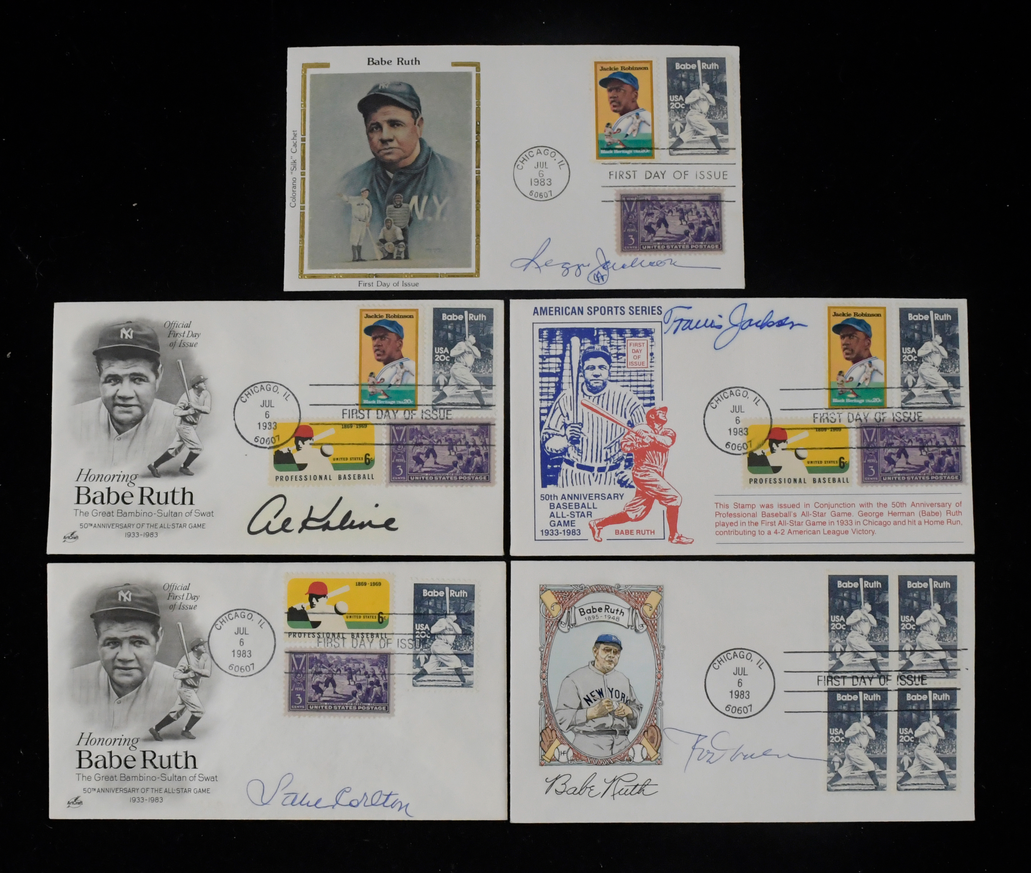 Description:Lot of (20) Baseball Hall of Famer autographed Babe Ruth related postal covers (EX-NM) Nice assortment of designs, all related to Babe Ruth and each is signed by a Hall of Famer. Includes Harmon Killebrew, George Kell, Al Kaline (secreterial signature of Sandy Koufax on back), Travis Jackson, Reggie Jackson, Monte Irvin, Catfish Hunter, Carl Hubbell, Burleigh Grimes (smudge), Lefty Gomez, Charles Gehringer, Rick Ferrell, Bob Feller, Bill Dickey, Joe Cronin, Stan Coveleski, Jocko Conlan, Happy Chandler, Steve Carlton, and Rod Carew. Ink and marker signatures rate 7 to 9 out of 10. Touch of light scattered wear: EX-NM