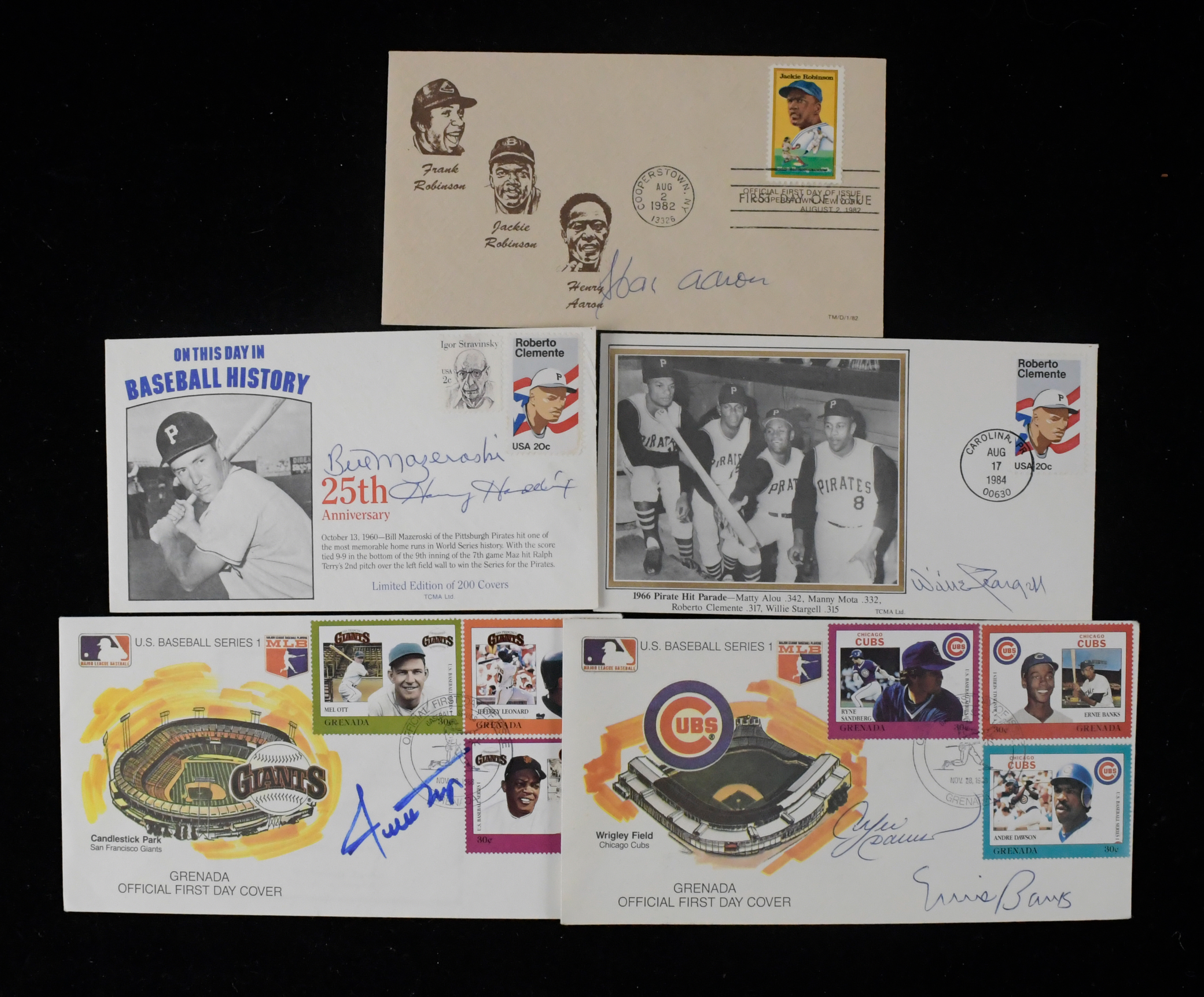 Description:Lot of (12) Baseball Hall of Famer autographed postal covers incl. Aaron and Mays (EX-NM) Interesting assortment including single and dual/multi signed pieces incl. Hank Aaron; Willie Mays; Juan Marichal and Warren Spahn (dual); Willie Stargell; Gaylord Perry; Al Kaline; Dick Allen and Robin Roberts dual; Harmon Killebrew; Juan Marichal and Gaylord Perry dual; Garylord Perry and Fergie Jenkins dual; Bill Mazeroski and Harvey Haddix dual; Ernie Banks and Andre Dawson dual. Signatures rate 7 to 9/10 out of 10. Hint of light wear: EX-NM