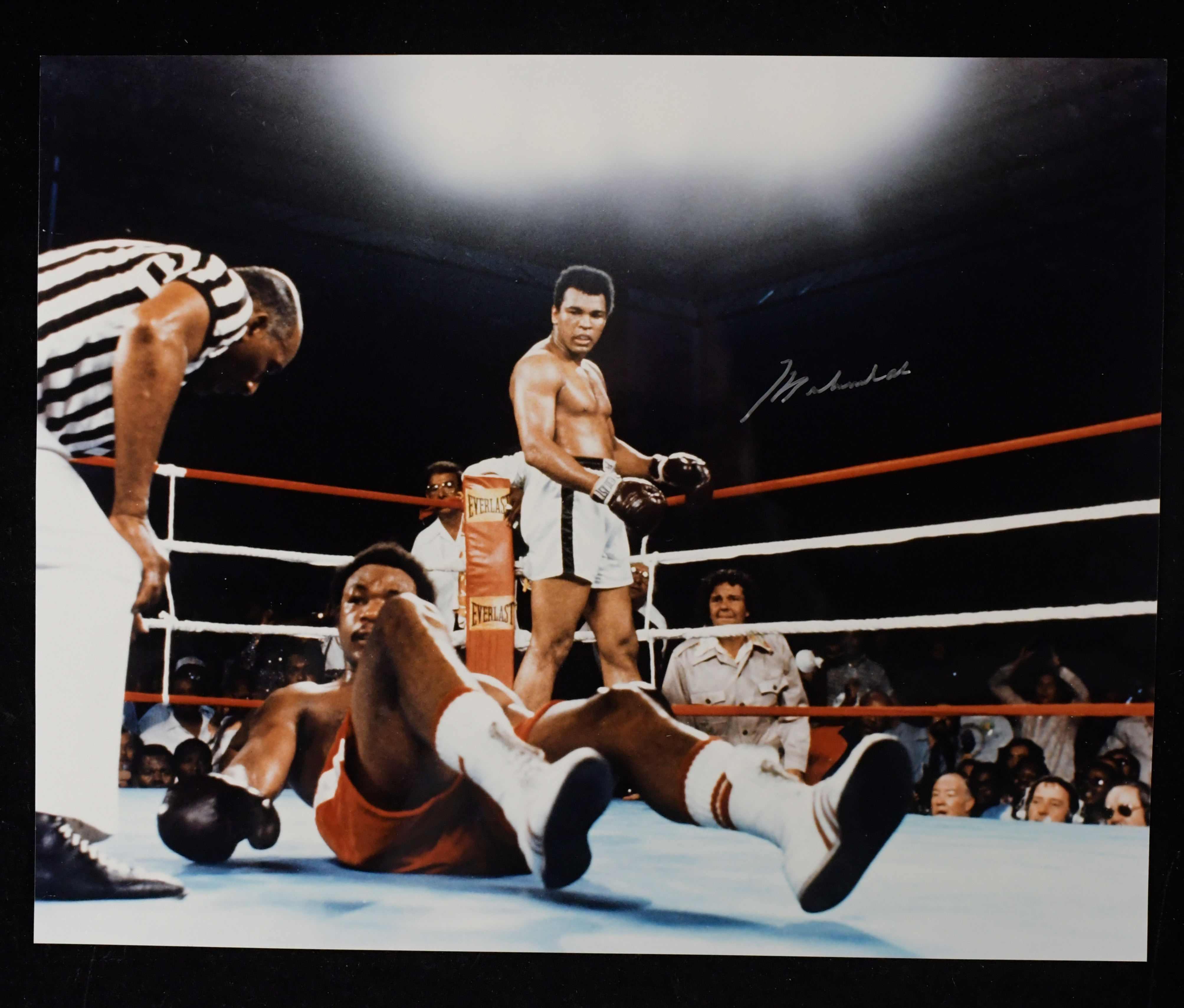 Description:Muhammad Ali autographed 16"x20" photograph (NM). Ali vs George Foreman photo signed by Ali in silver marker. Signature rates 8 out of 10: NM ($400-$600)