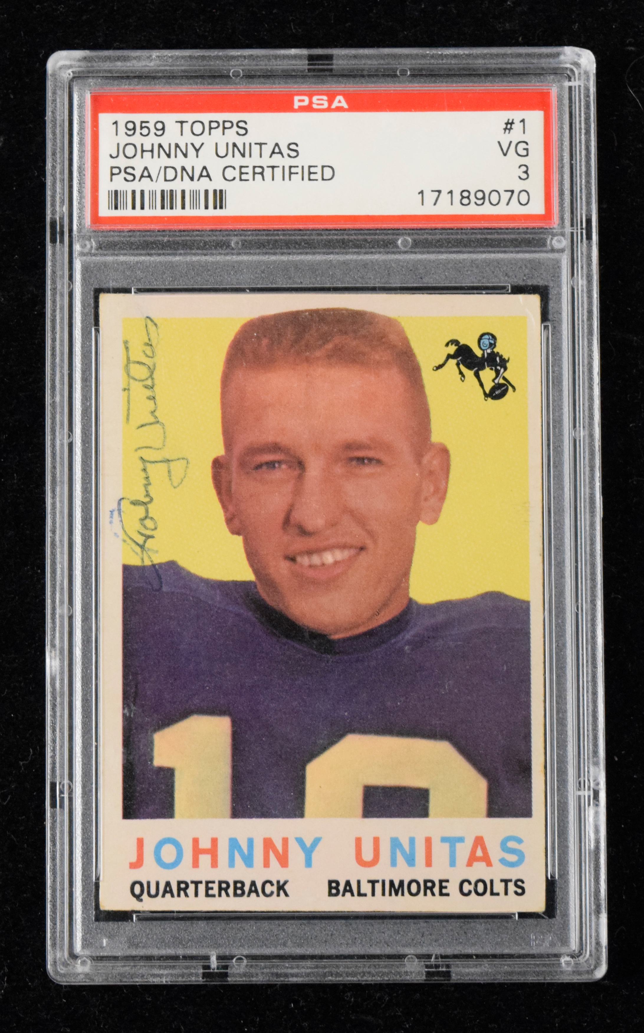 Description:1959 Topps #1 Johnny Unitas autographed card (PSA VG 3, Sig. EX-EX/MT) Vintage card is graded VG 3 by PSA. Ink signature rates 6-7 out of 10 (see image). Note there is some light wear to holder: PSA VG 3