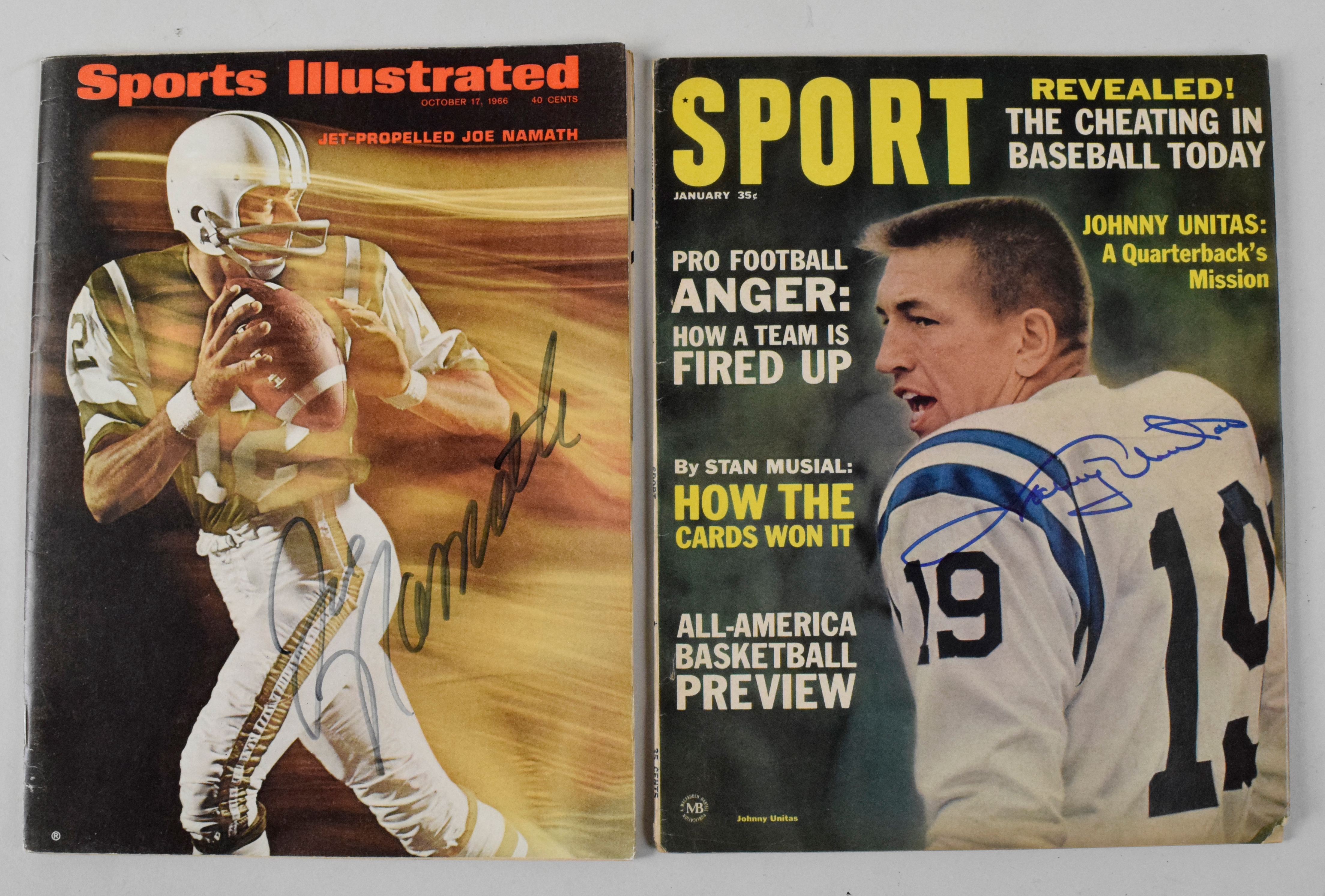 Description:Joe Namath and Johnny Unitas autographed publications (Sigs. EX/MT-NM, Magazines VG and EX-EX/MT) Includes Namath signed 1966 Sports Illustrated and Unitas signed 1965 Sport Magazine. Mild scattered wear (small chip to cover of Unitas). Signatures rate 7 (Namath) and 9 out of 10: Sigs. EX/MT-NM, Magazines VG and EX-EX/MT