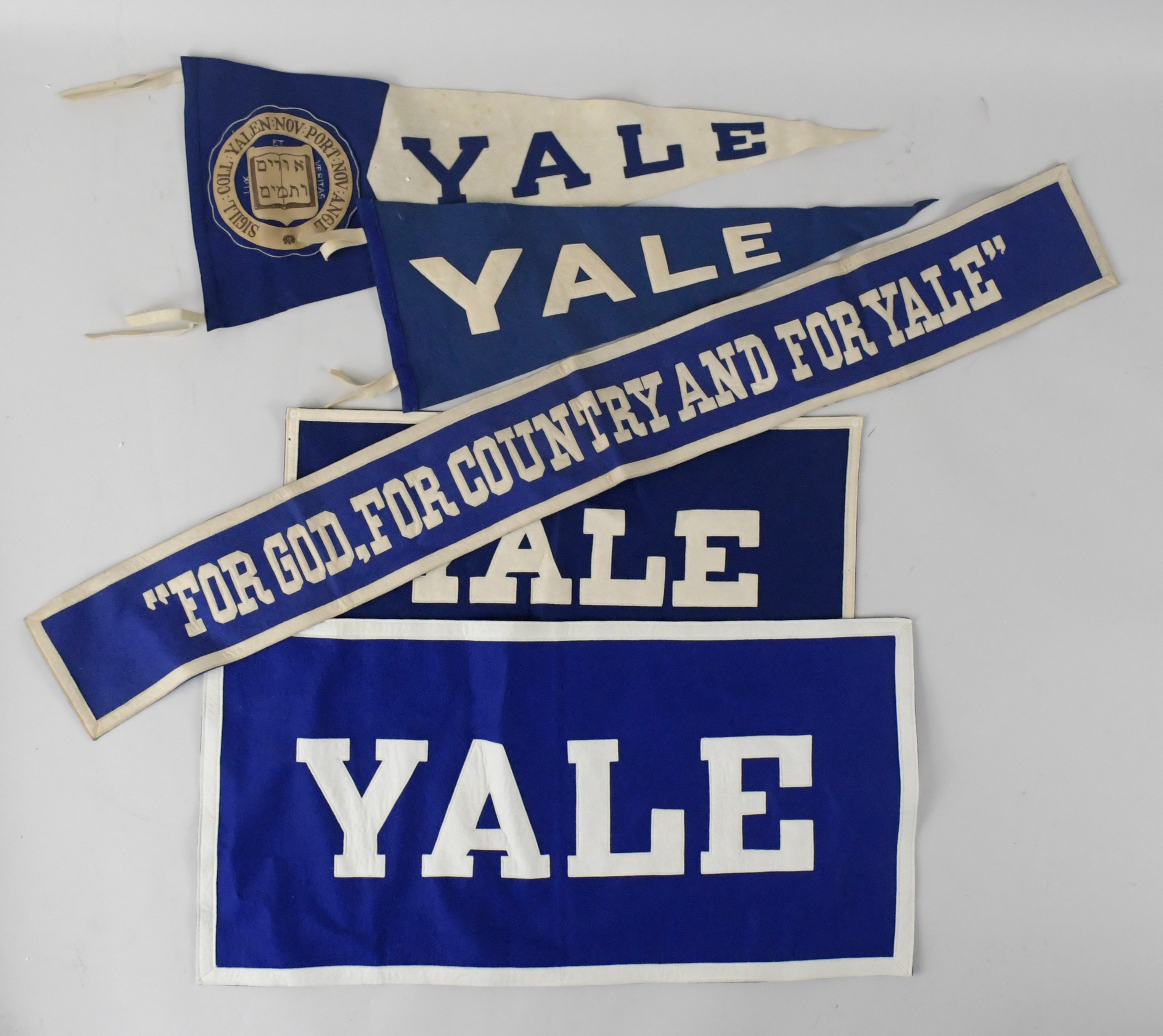 Description:Lot of (8) vintage Yale banners and pennants (VG/EX-NM). Includes (2) 5.5"x46.5" "For God, For Country And For Yale" banners, 22"x45" Yale banner, 22"x22" Yale banner, 14.5"x28.5" Yale banner, 11.5"x23" Yale banner, 29" Collegiate Manufacturing Co. Yale pennant, and 24" Yale pennant. Most appear to average EX-EX/MT overall. Range: VG/EX-NM ($400-$600)