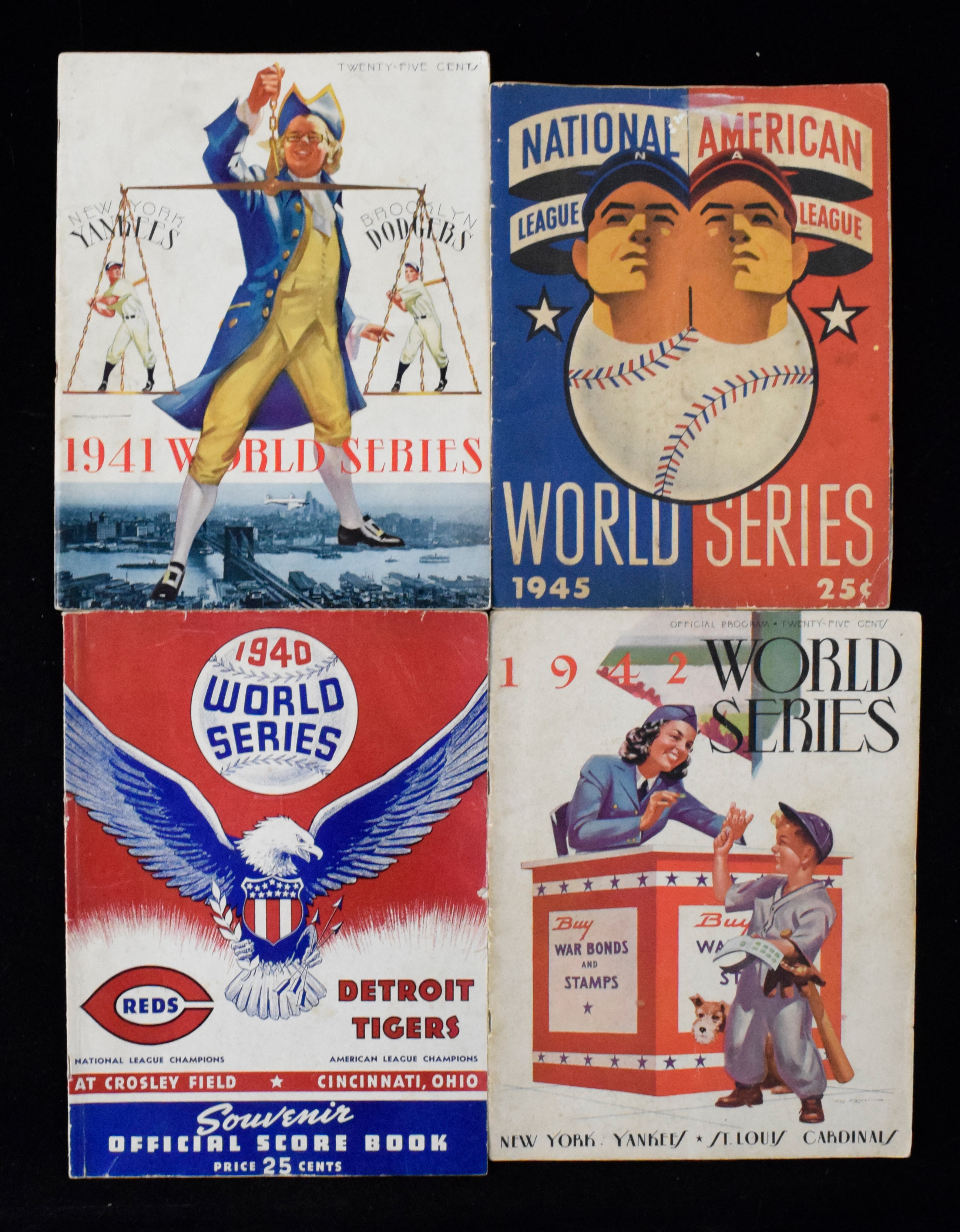Description:Lot of (4) World Series programs from 1940-1945 (GD-VG/EX). Includes 1940 Crosley Field version (VG unscored), 1941 scored from Game 2 (VG-VG/EX), 1942 Yankee Stadium version (VG unscored), and 1945 Wrigley Field version (GD unscored).