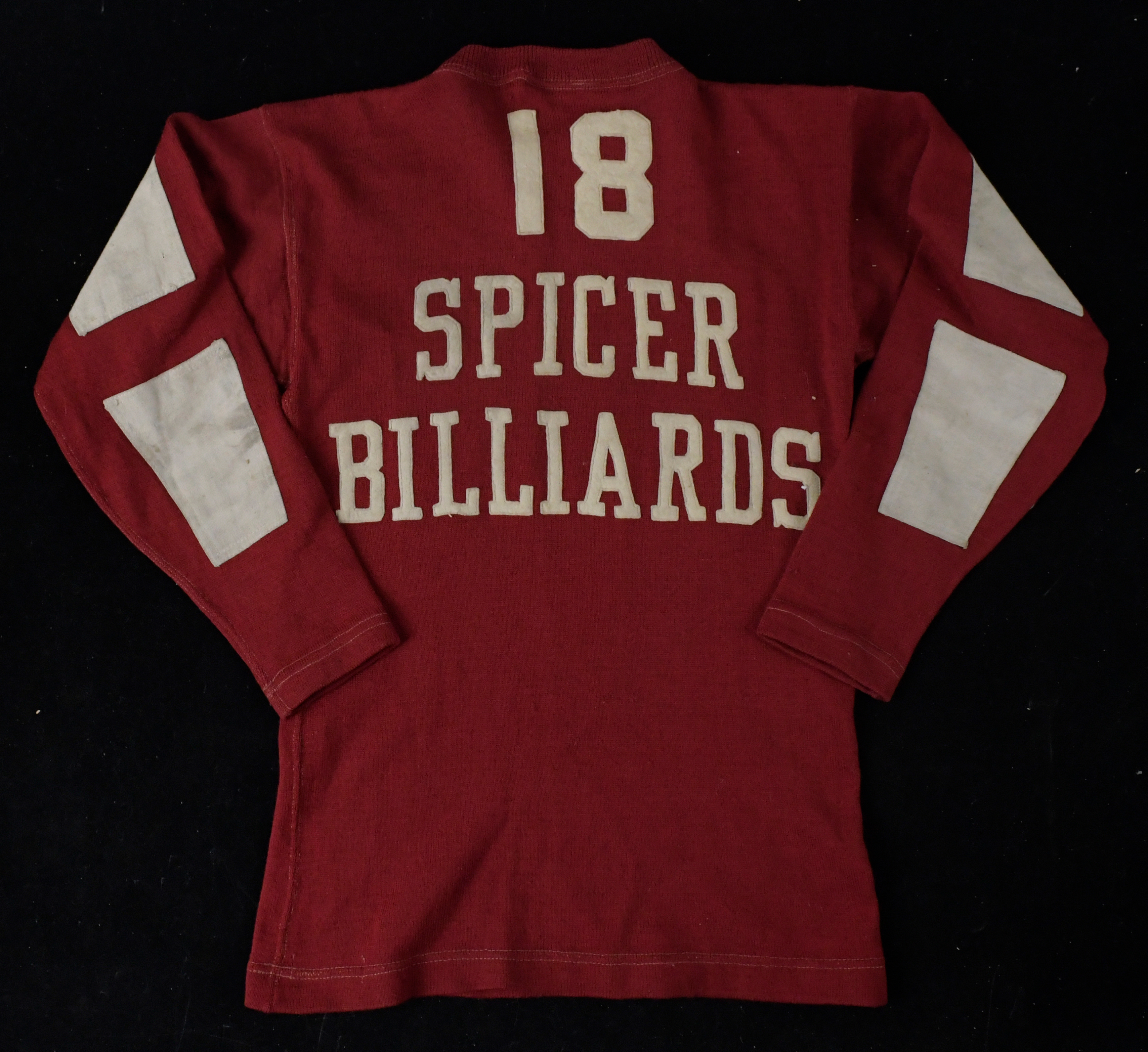 Description:Buckeye Cycle Co. friction strip style football jersey, c.1920s-30s (EX). The Buckeye Cycle Co. jersey with #18 "SPICER BILLIARDS" sewn on the back, and white canvas strips sewn on the chest and sleeves. Visible wear, with areas of stretched fabric, but not extreme: EX/MT ($500-$750)