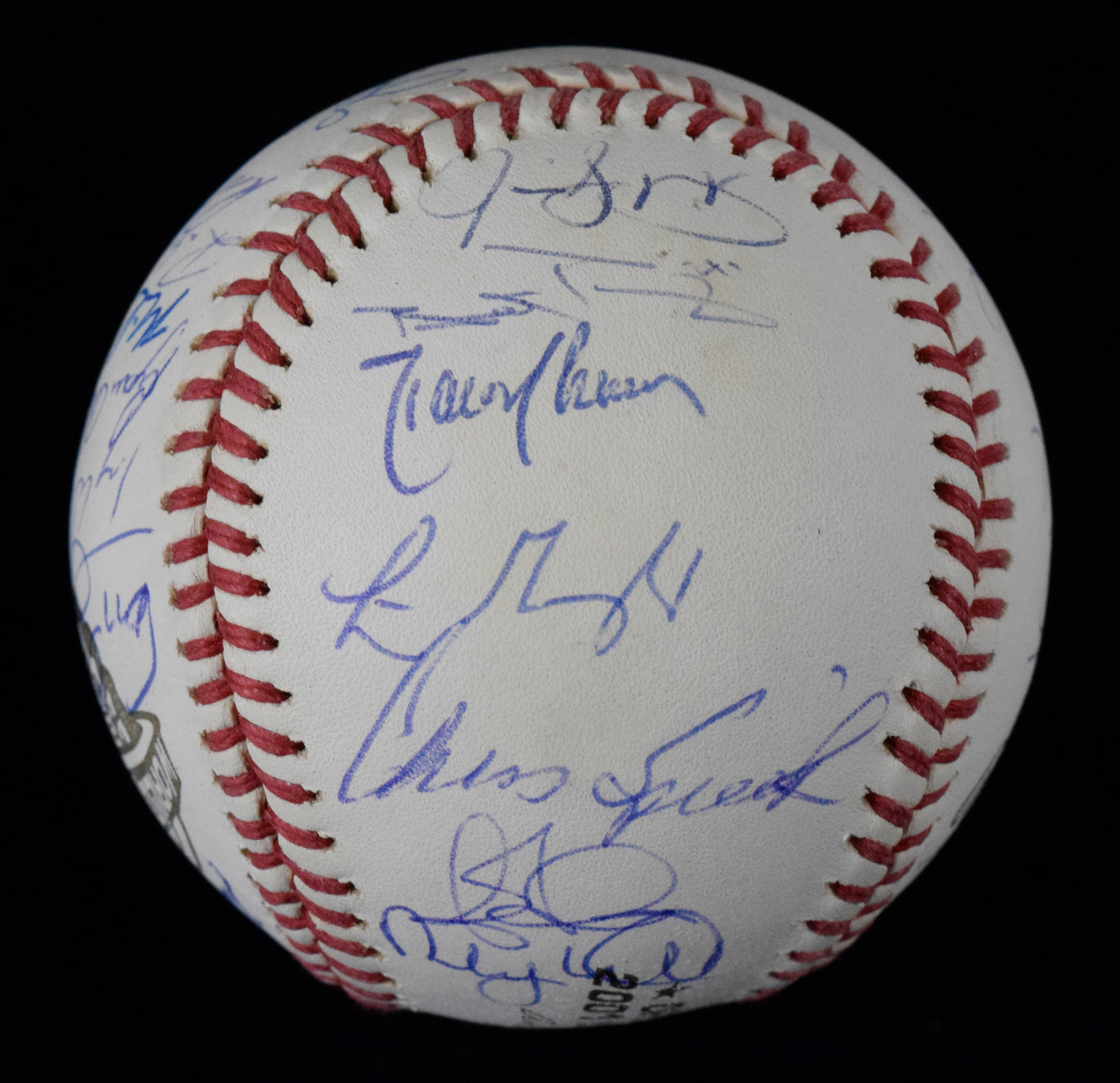 Description:2001 Arizona Diamondbacks team signed World Series baseball (EX-EX/MT). Rawlings official 2001 World Series ball signed by (34) members of the champion Diamondbacks including Bob Brenly, Randy Johnson, Curt Schilling, Luis Gonzalez, Mark Grace, Craig Counsell, Damian Miller, Tony Womack, Albie Lopez, Jay Bell, David Dellucci, Junior Spivey, and others. Signatures rate 5/6 to 9 (avg 7) out of 10: EX-EX/MT