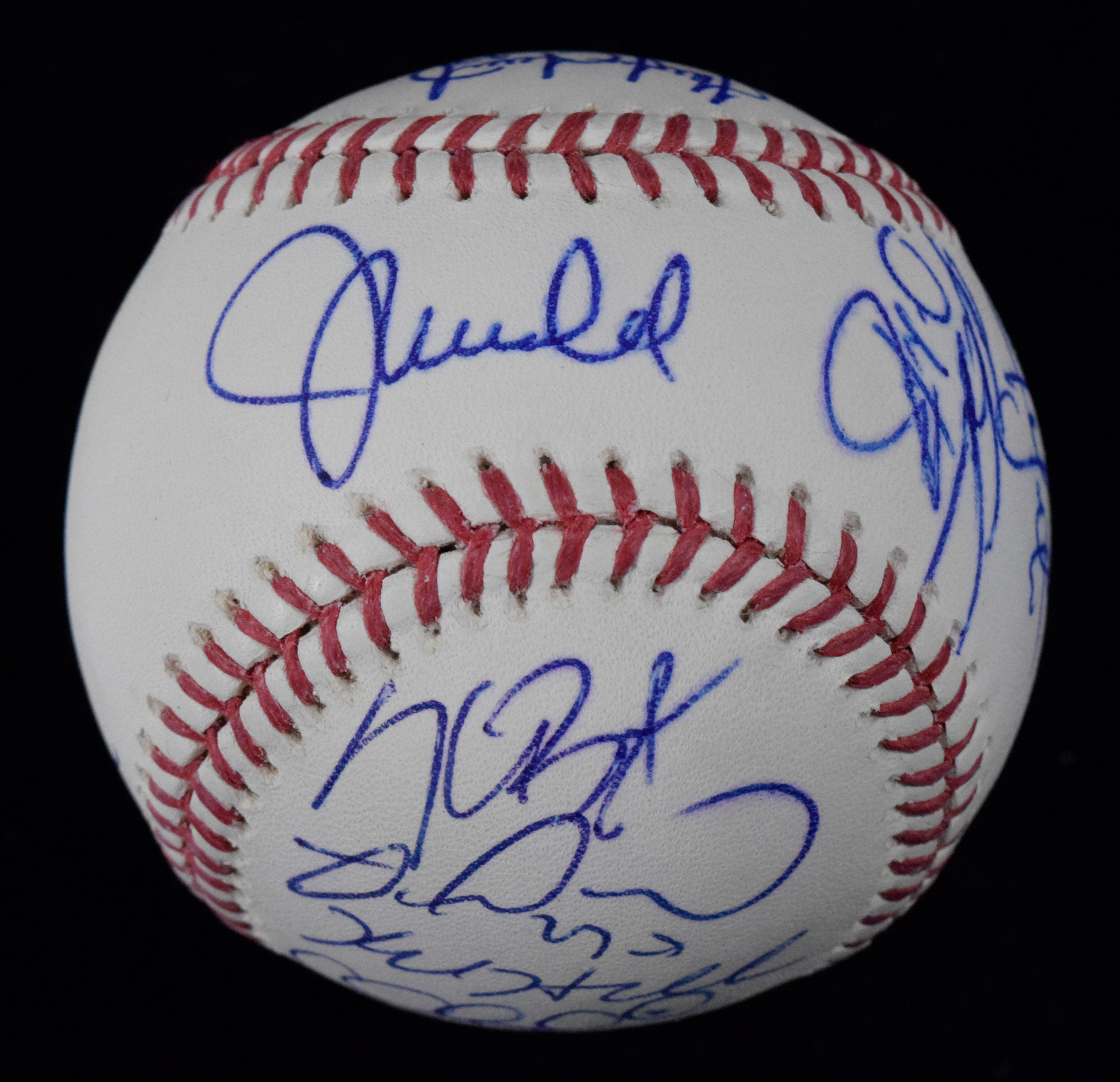 Description:2016 Chicago Cubs multi-signed World Series baseball (NM). Rawlings official 2016 World Series ball signed by (15) members of the champion Cubs including Joe Maddon, Kris Bryant, Kyle Schwarber, Kyle Hendricks, Jake Arrieta, Ben Zobrist, Javier Baez, Travis Wood, Chris Coghlan, Mike Montgomery, and others. Signatures rate 7 to 9/10 (avg 8) out of 10: NM