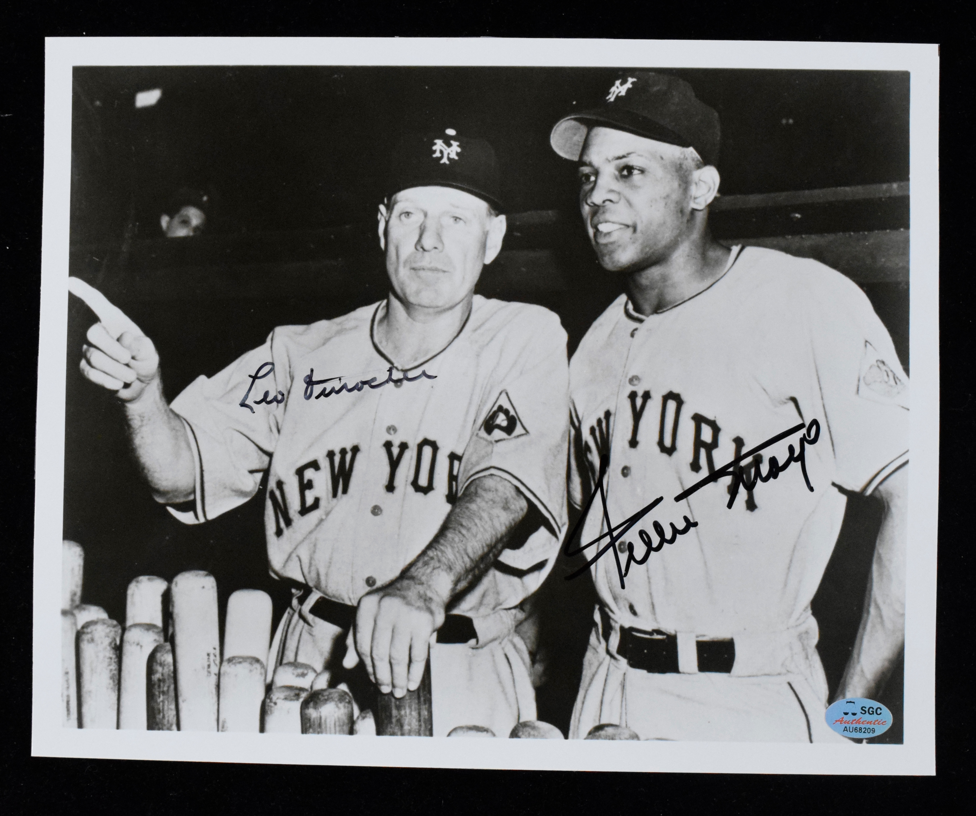 Description:Willie Mays signed 8"x10" photograph with Leo Durocher (NM see description). 8"x10" photo with Willie Mays and Leo Durocher signatures in black marker. SGC Authentic serial #AU68209 hologram sticker is on the photo, and their database notes the autographs as being authentic, although one could question the Durocher authenticity: NM