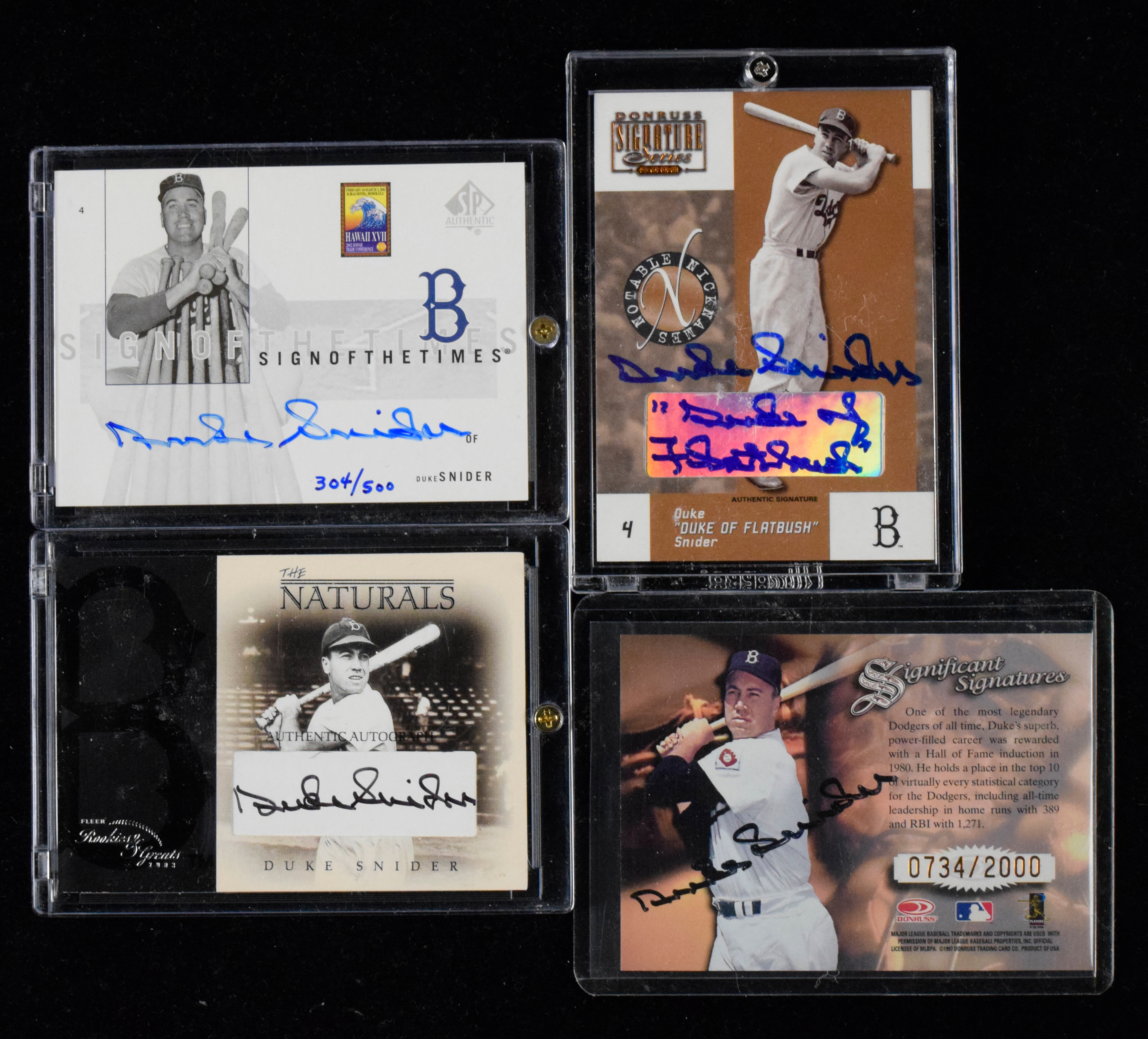 Description:Lot of (4) Duke Snider signed serial numbered insert cards (NM-NM/MT). Includes 1997 Donruss Signature Series "Significant Signatures" signed by Snider (#ed 734/2000), 2002 Hawaii Trade Conference SP Authentic "Sign Of The Times" #DS signed by Snider (#ed 304/500), 2003 Donruss Signature Series "Notable Nicknames Autographs" #NN-7 signed by Snider with "Duke of Flatbush" inscription (#ed 27/100), and 2003 Fleer Rookies & Greats "The Naturals Autograph" #N-DS signed by Snider (#ed 12/50). Signatures rate 7/8 (SP Authentic) to 10 (avg 8/9) out of 10: NM-NM/MT
