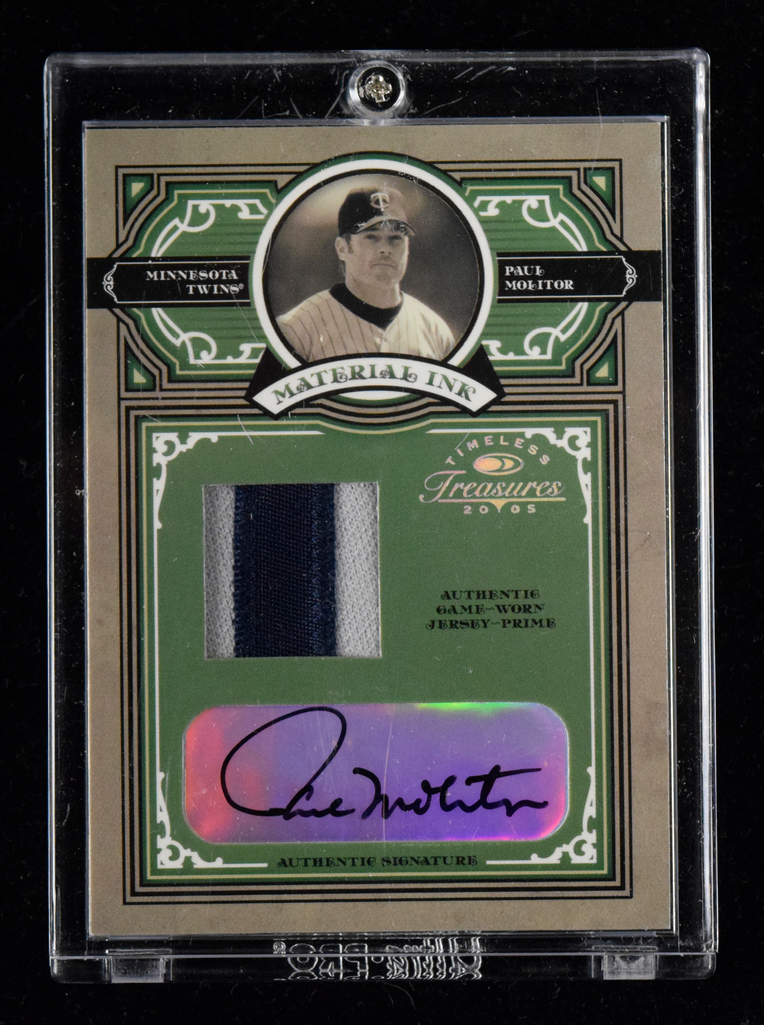 Description:Paul Molitor signed 2005 Donruss Timeless Treasures jersey insert card numbered 3/5 (NM). 2005 Donruss Timeless Treasures "Material Ink Jersey Prime" #MI-4 signed by Molitor in black marker. Signature rates 9/10 out of 10. The card is numbered 3/5: NM