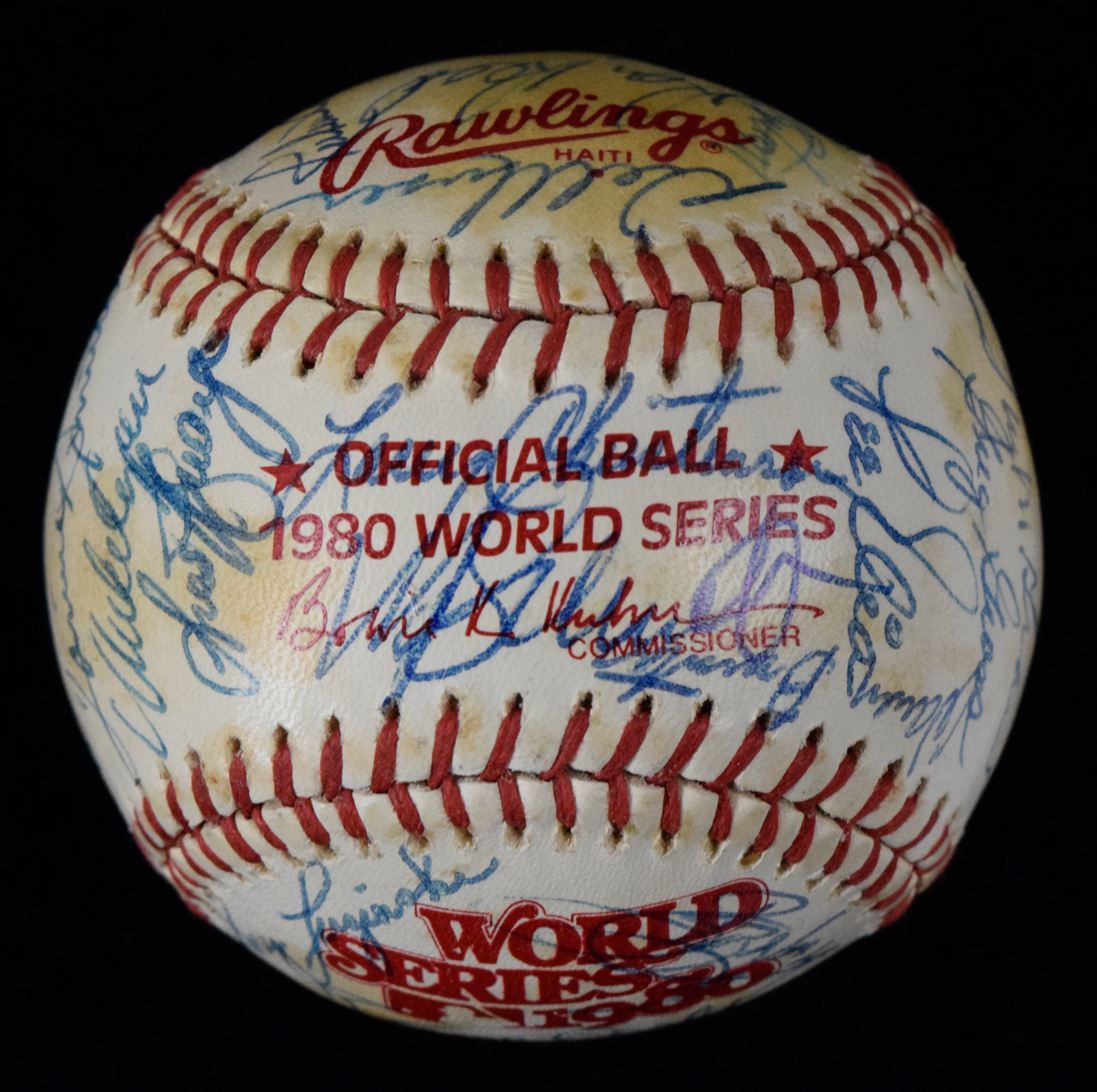 Description:1980 World Series champion Philadelphia Phillies team signed baseball with (38) signatures - JSA (VG/EX). B.Kuhn 1980 World Series ball signed by Dallas Green, Mike Schmidt, Steve Carlton, Pete Rose, Tug McGraw, Manny Trillo, Bake McBride, Garry Maddox, Larry Bowa, Bob Boone, Greg Luzinski, Sparly Lyle (signed twice), John Vukovich, Dick Ruthven, Lonnie Smith, Marty Bystrom, Larry Christenson, Del Unser, Greg Gross, and others. Signatures rate 6/7 to 10 (avg 8) out of 10. Includes full LOA from JSA. Areas of toning on each panel: VG/EX ($500-$750)