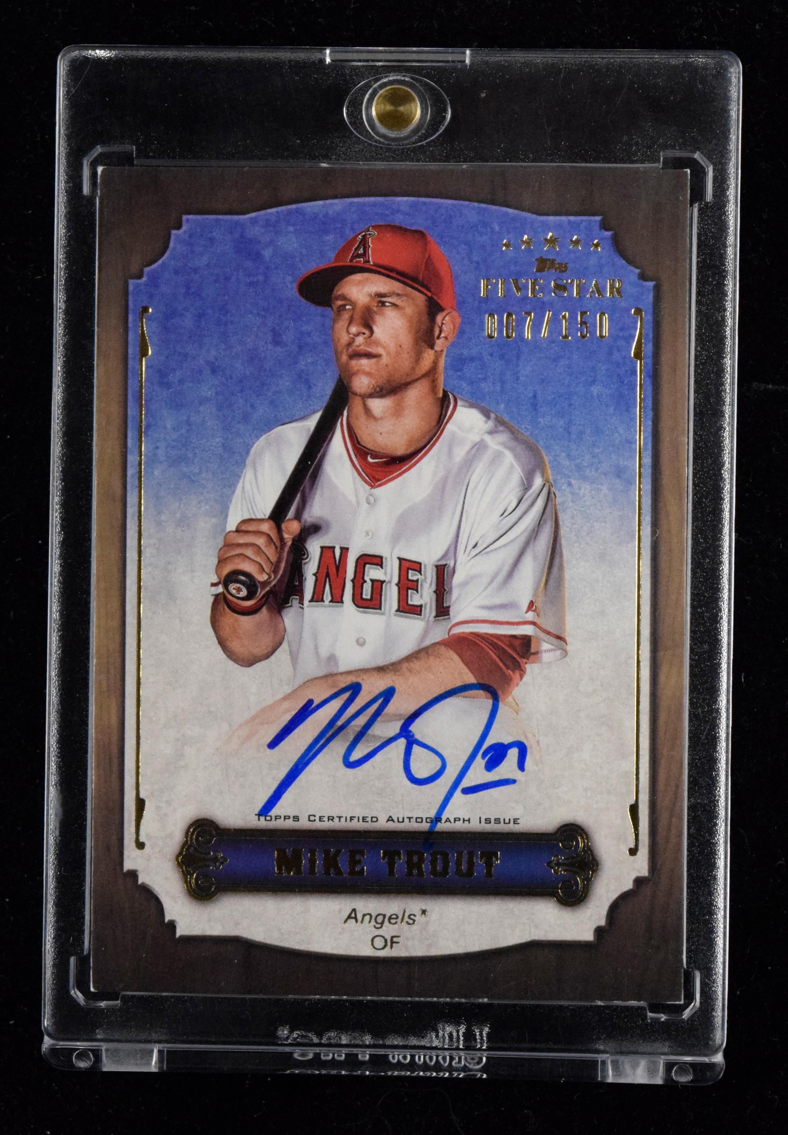 Description:Mike Trout signed 2012 Topps Five Star serial numbered insert card (EX/MT). 2012 Topps Five Star "Active Autographs" #FSA-MT signed by Trout in blue marker. Signature rates 9/10 out of 10. The card is #ed 7/150. Minor corner wear: EX/MT