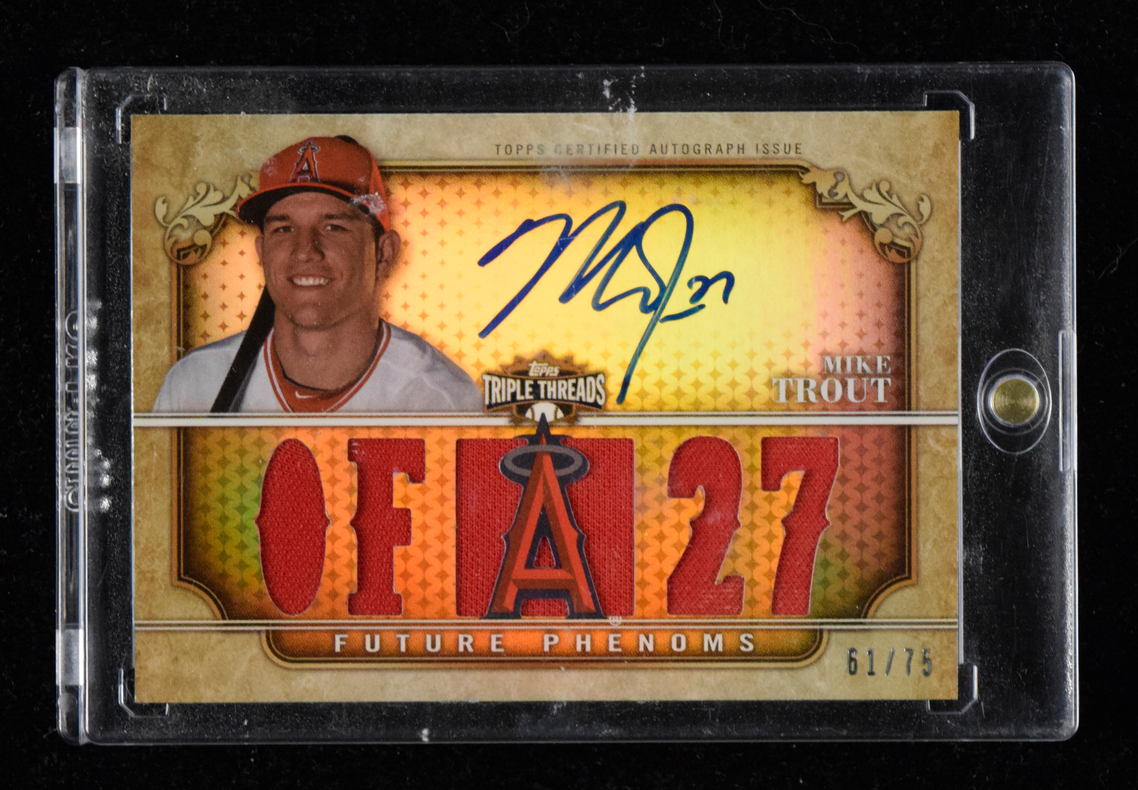 Description:Mike Trout signed 2013 Topps Triple Threads serial numbered relic insert card (NM). 2013 Topps Triple Threads "Sepia" #101 jersey card signed by Trout in blue marker. Signature rates 9 out of 10. The card is #ed 61/75: NM