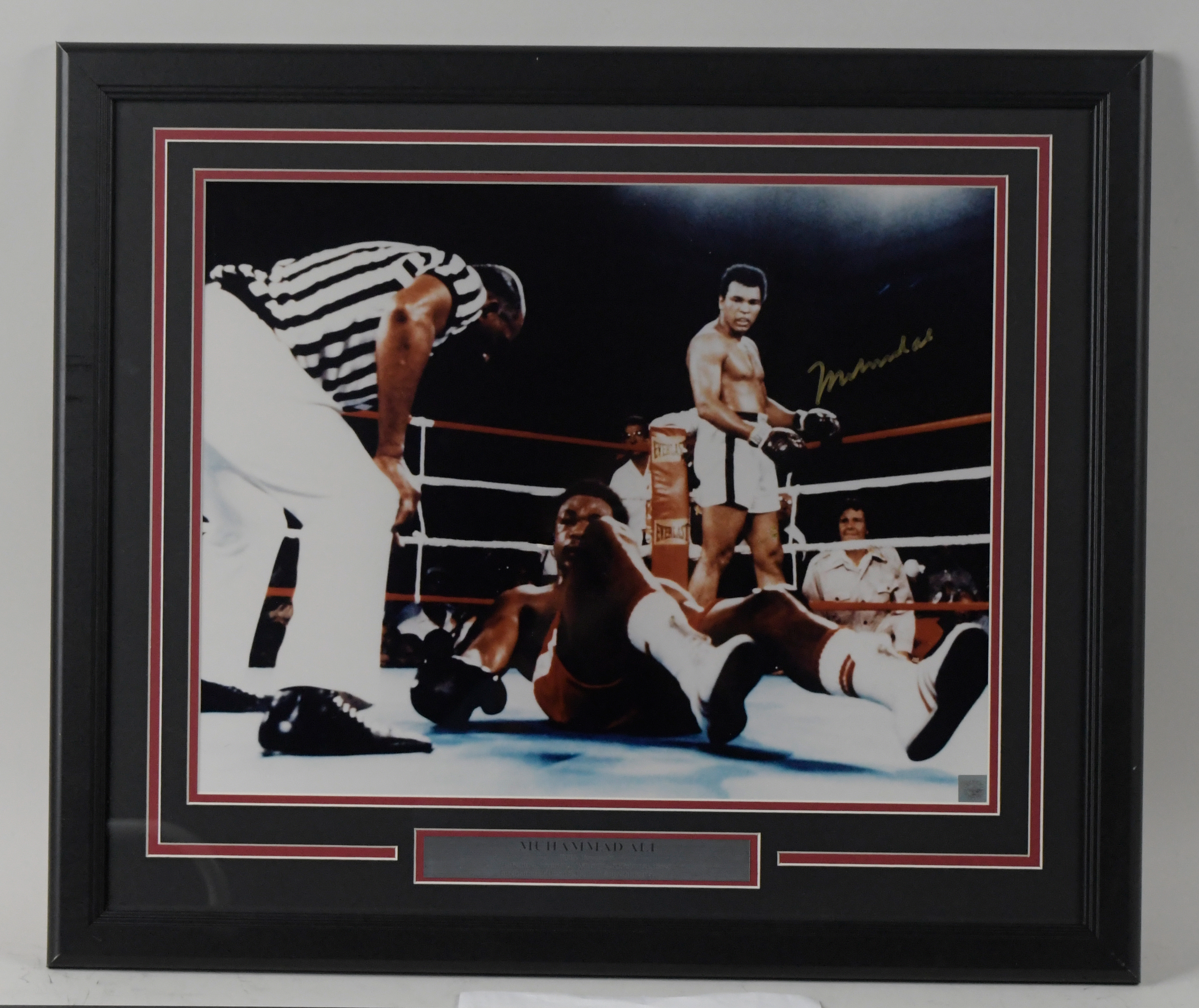 Description:Muhammad Ali autographed oversize framed photograph - JSA (NM). Frame measures approx. 22.5"x26". Ali signed the photo in gold marker. Signature rates 8/9 out of 10. Includes full LOA from JSA. Due to framing, complete condition is unknown: NM appearance ($400-$600)