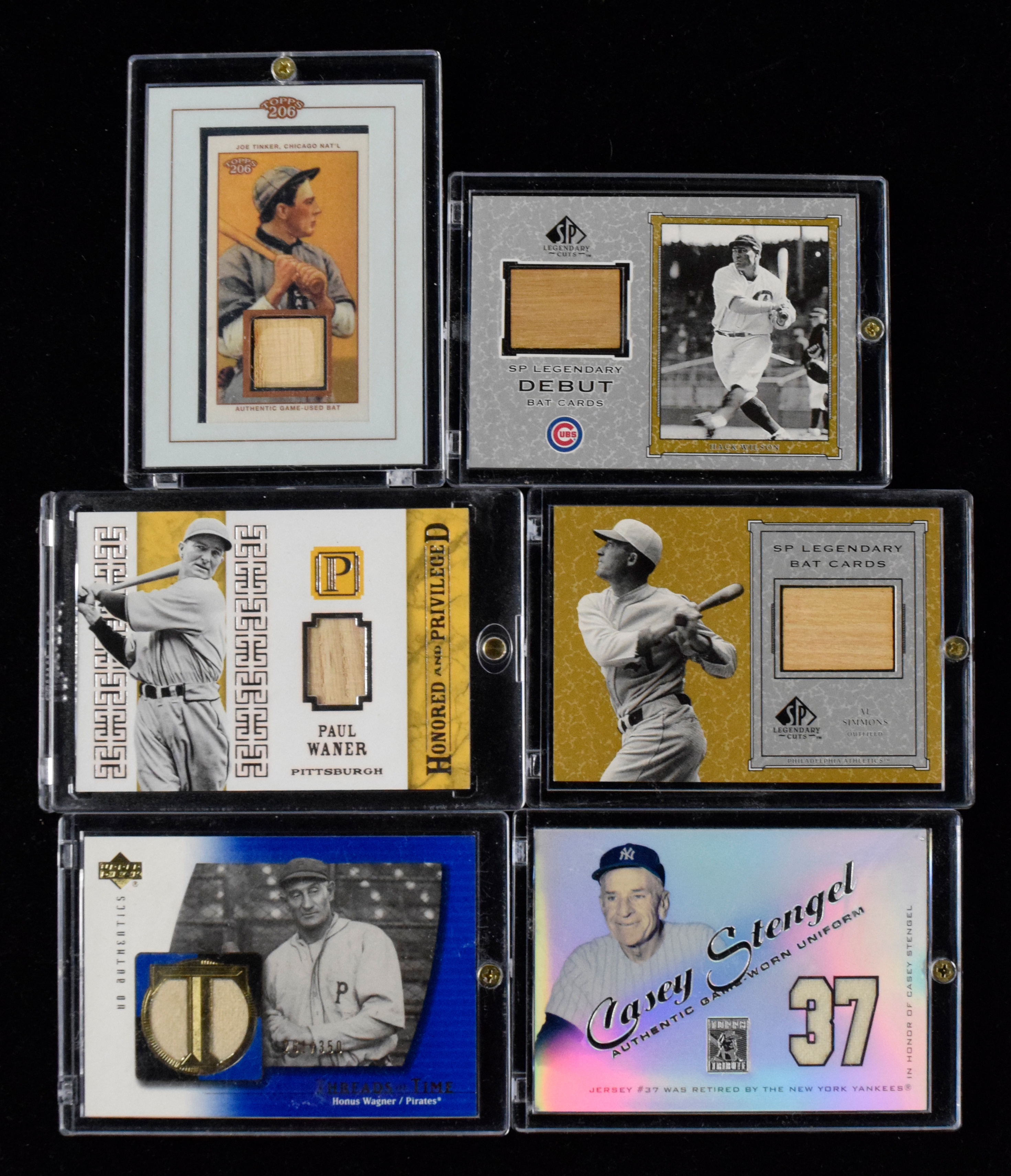 Description:Lot of (8) Baseball HOFers relic swatch insert cards including Wagner (NM-NM/MT). Includes 2002 Topps Stadium Club "World Champion Relics" #WC-EM2 Eddie Murray, 2001 Topps Tribute "Game Worn Relics" #RJ-CS Casey Stengel, 2001 SP Legendary Cuts "Game-Used Bats" #B-AS Al Simmons, 2001 SP Legendary Cuts "Debut Game-Used Bats" #s D-GS George Sisler and D-HW Hack Wilson, 2002 Topps 206 "Framed Relics" #TR-JT Joe Tinker, 2003 Upper Deck Authentics "Threads of Time" #TT-HW Honus Wagner (#ed 261/350), and 2016 Panini Pantheon "Honored and Privileged" #HP-PW Paul Waner (#ed 24/25): NM-NM/MT