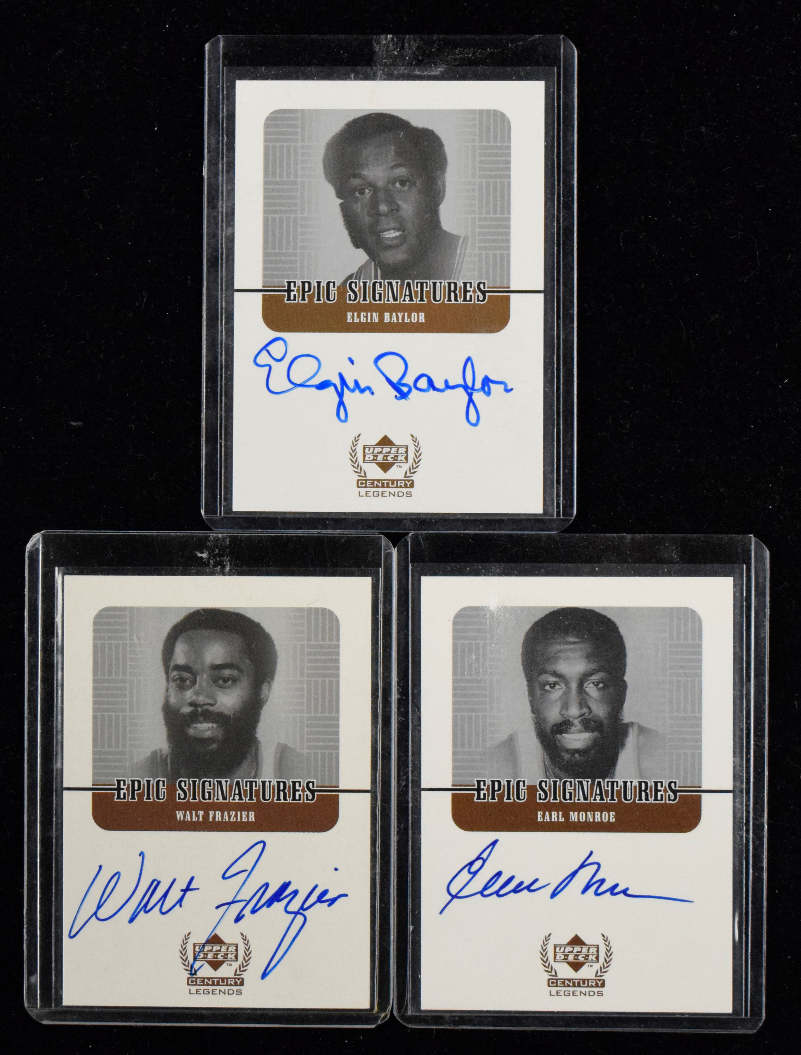 Description:Elgin Baylor, Earl Monroe, and Walt Frazier signed 1998-99 Upper Deck Century Legends insert cards (NM-NM/MT). Includes 1998-99 Upper Deck Century Legends "Epic Signatures" #s EB signed by Elgin Baylor, EM signed by Earl Monroe, and WF signed by Walt Frazier. Signatures rate 9 to 10 out of 10: NM-NM/MT