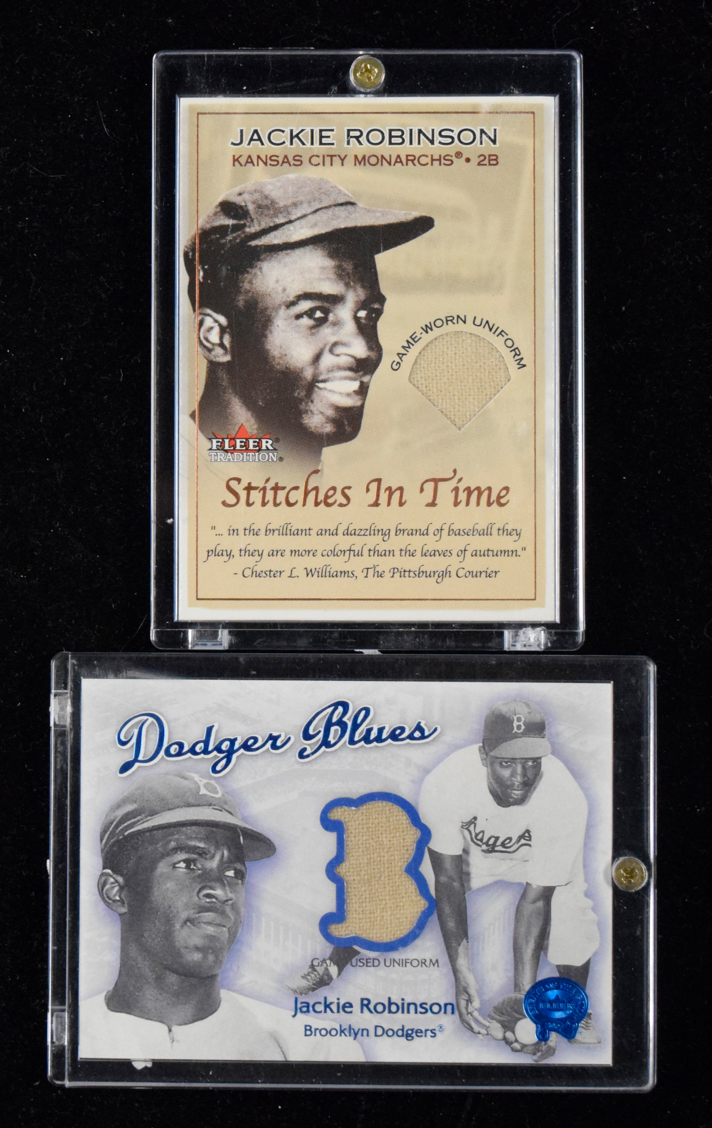 Description:Lot of (2) Jackie Robinson relic swatch insert cards (NM-NM/MT). Includes 2001 Fleer Greats Of The Game "Dodger Blues" Robinson uniform card, and 2001 Fleer Tradition "Stitches in Time Memorabilia" Robinson uniform card: NM-NM/MT