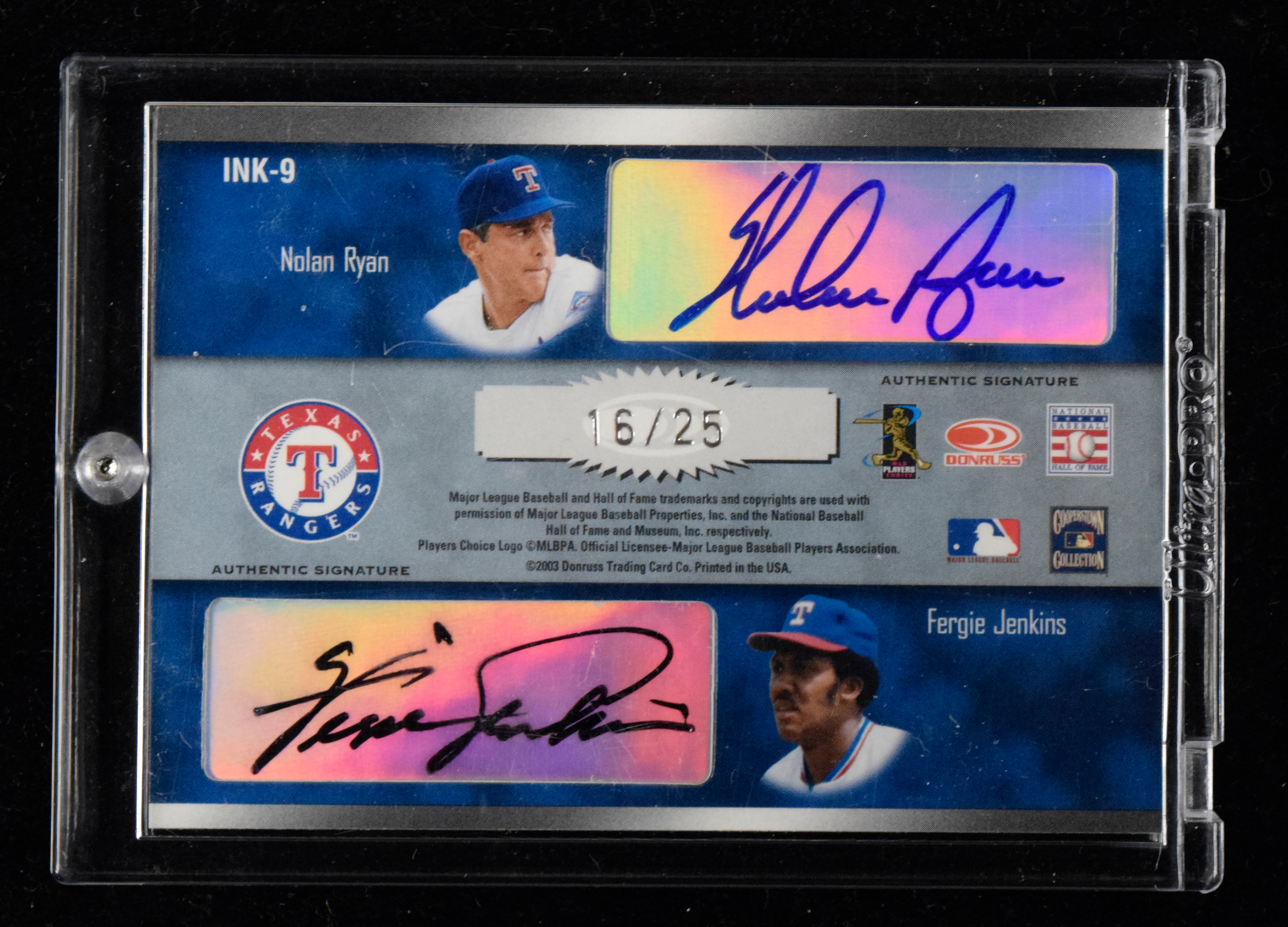 Description:Nolan Ryan, Fergie Jenkins, Rafael Palmeiro, Alex Rodriguez multi-signed insert card #ed 16/25 (NM). 2003 Donruss Signature Series "INKredible Four" #INK-9 signed by Ryan and Jenkins on the back, and signed by Palmeiro and Rodriguez on the front. Signatures rate 8/9 to 10 out of 10. The card is numbered 16/25: NM
