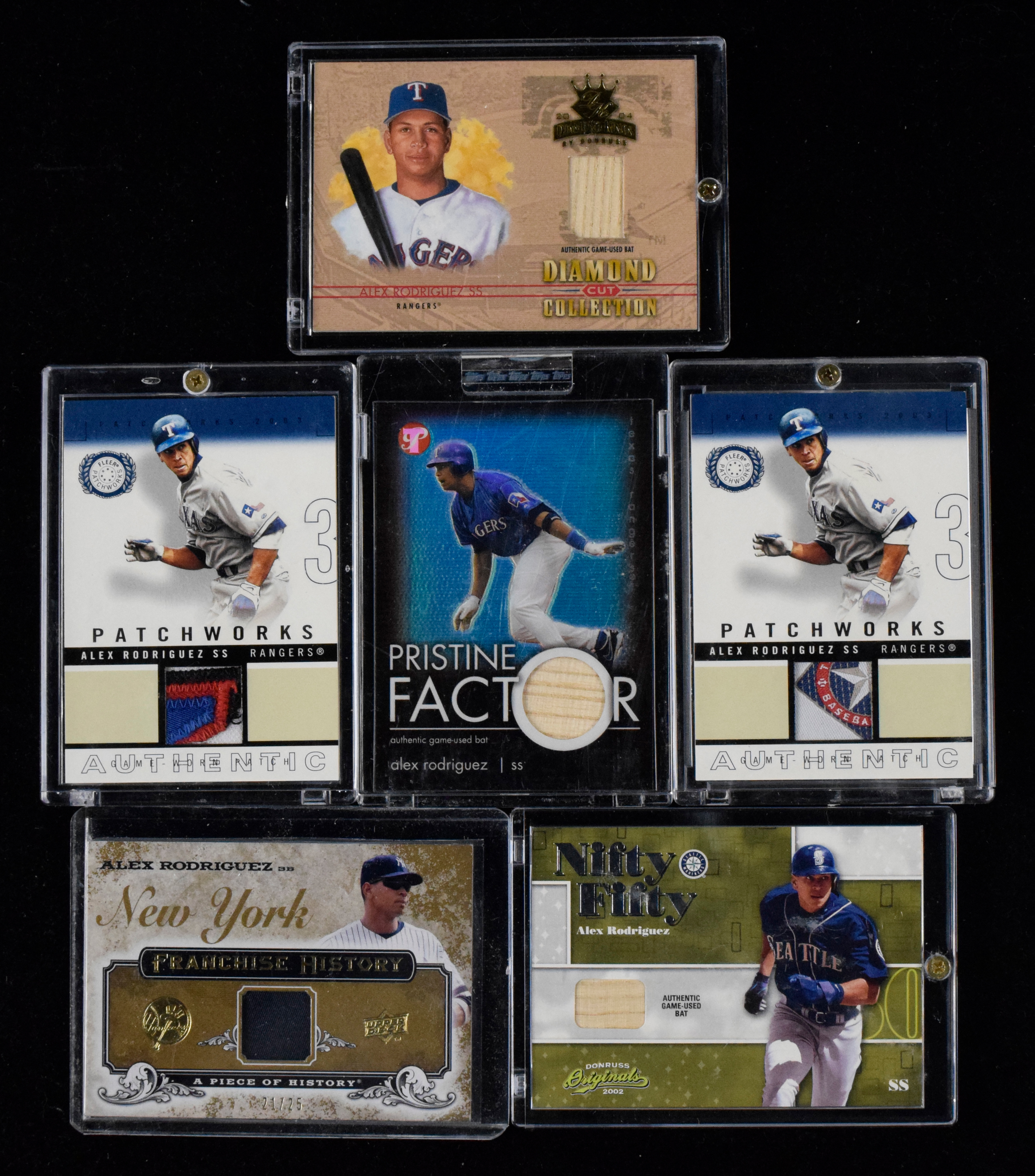 Description:Lot of (50) Alex Rodriguez relic swatch insert cards (NM-NM/MT overall). Serial #ed cards include 21/25, 25/25, 31/50, 60/100, 90/250, 184/300, 187/300, 199/425, 68/500, 267/500, 647/800, 814/899, and 1168/1998. most cards appear to average NM-NM/MT overall.