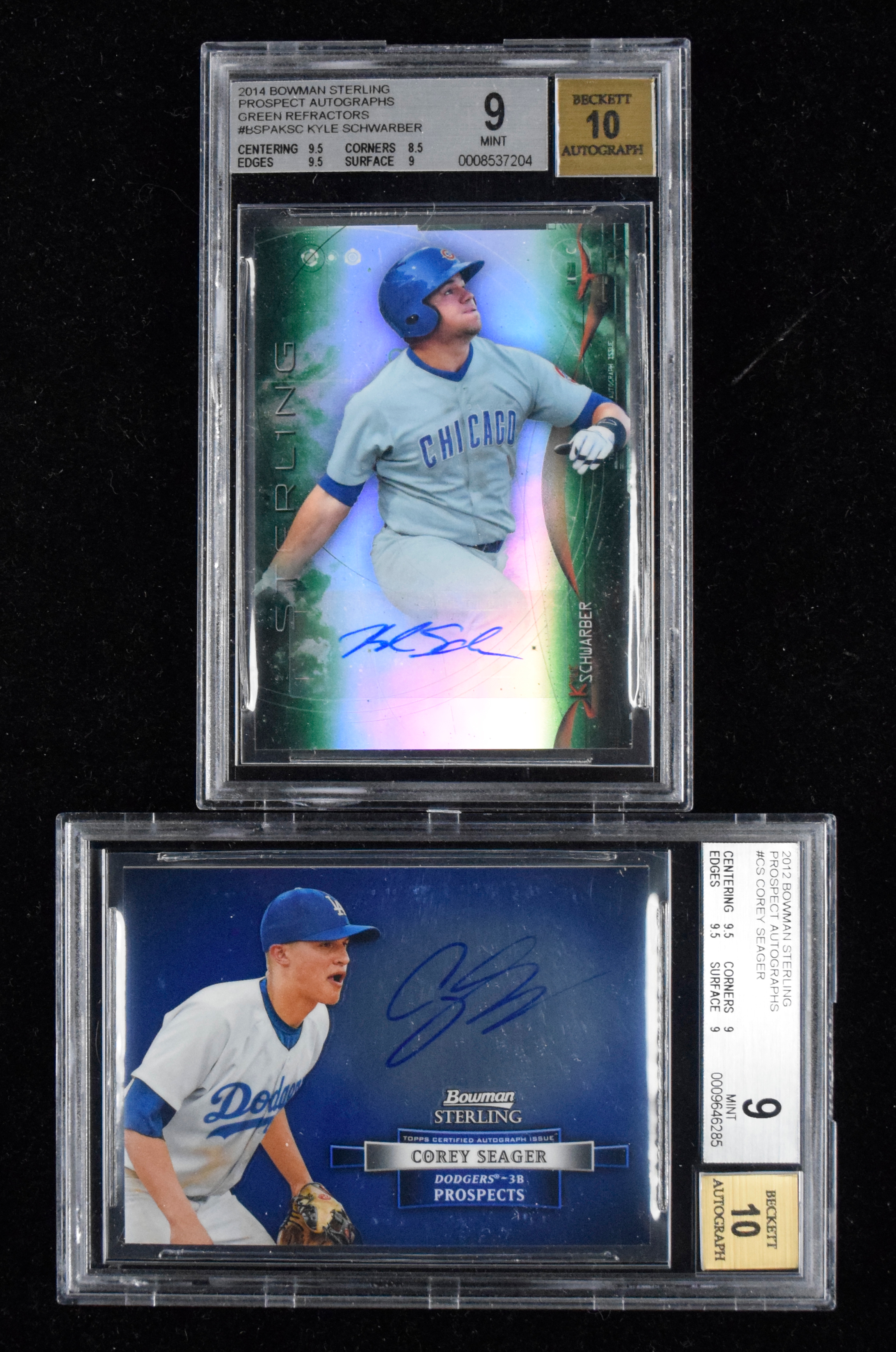 Description:Kyle Schwarber & Corey Seager signed rookie insert cards both graded Beckett 9 (MT, autos graded 10). Includes 2012 Bowman Sterling "Prospect Autographs" #BSAP-CS signed by Seager (Beckett 9 MT, auto graded 10); and 2014 Bowman Sterling "Prospect Autographs Green Refractors" #BSPA-KSC signed by Schwarber #ed 34/125 (Beckett 9 MT, auto graded 10).