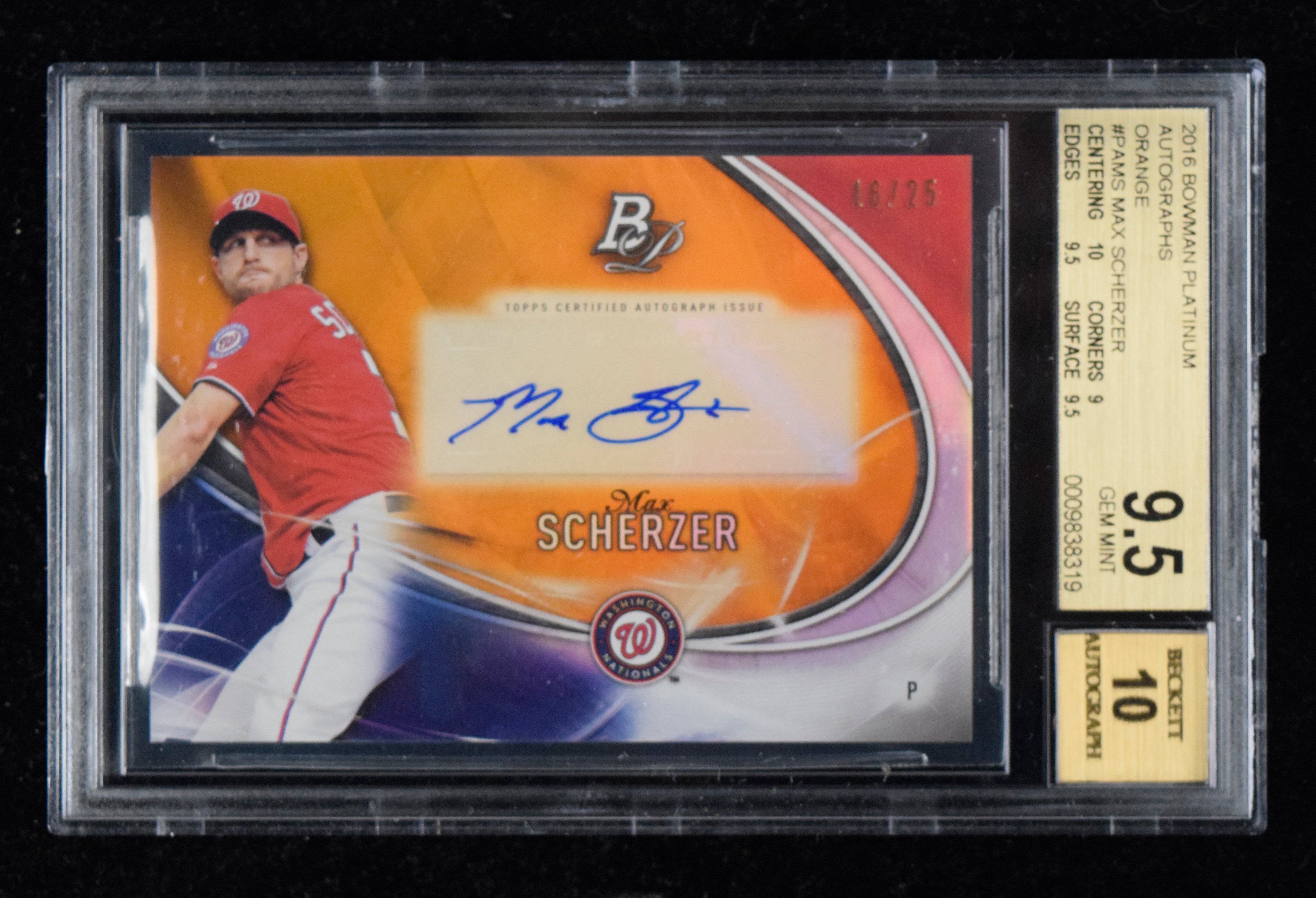 Description:2016 Bowman Platinum "Autographs Orange" #PA-MS Max Scherzer signed insert card #ed 16/25 graded Beckett 9.5 (Gem MT, auto 10).