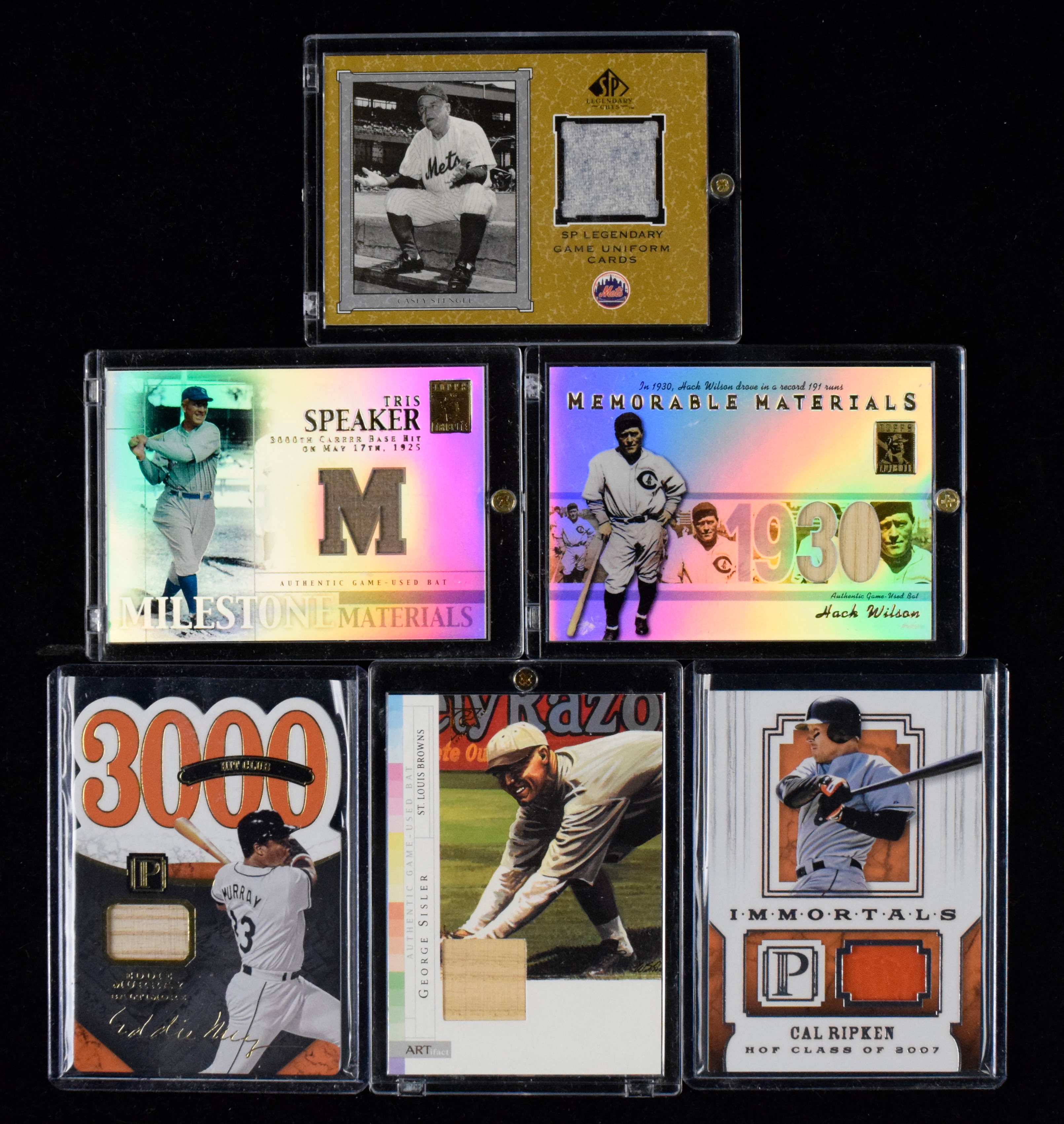 Description:Lot of (26) baseball stars and HOFers relic swatch insert cards (NM-NM/MT overall). Includes quad-relic card of Phil Niekro / Mariano Rivera / Tommy John / Paul O'Neill, triple-relics card of Frank Thomas / Cal Ripken Jr / Barry Bonds, triple-relics card of Mariano Rivera / Roger Clemens / Bernie Williams, and dual-relics card of Mariano Rivera / Andy Pettitte. Remainder are individial player relics cards: George Sisler, Tris Speaker, Hack Wilson, Casey Stengel, (2) John Smoltz, (5) Cal Ripken Jr, (8) Eddie Murray, Mariano Rivera, Dale Murphy, and Trea Turner: NM-NM/MT overall