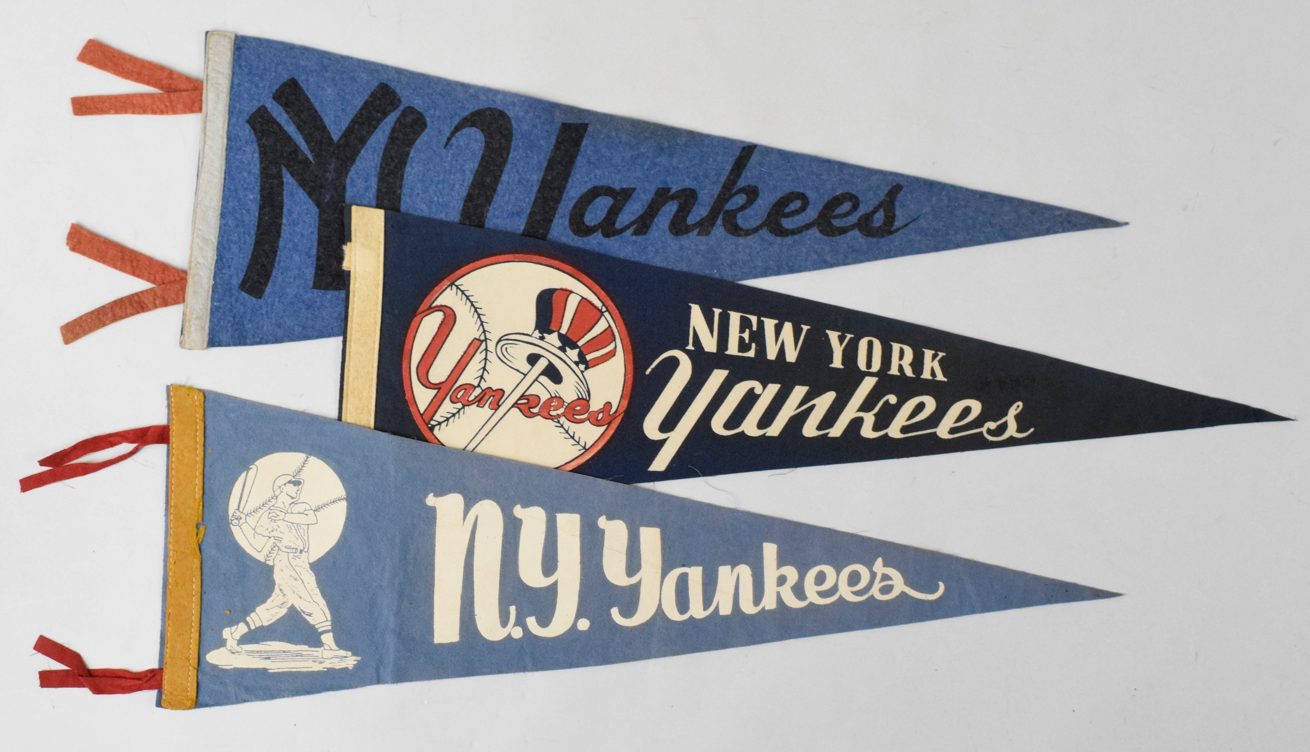 Description:Lot of (3) vintage New York Yankees pennants, c.1940s-70s (VG-EX). Includes c.1940s-50s 26" Yankees pennant with batter graphic (VG), c.1950s 25" blue Yankes pennant with black text and orange tassels (EX), and c.1960s-70s 25.5" dark blue Yankees pennant with white text (VG clipped tassels).