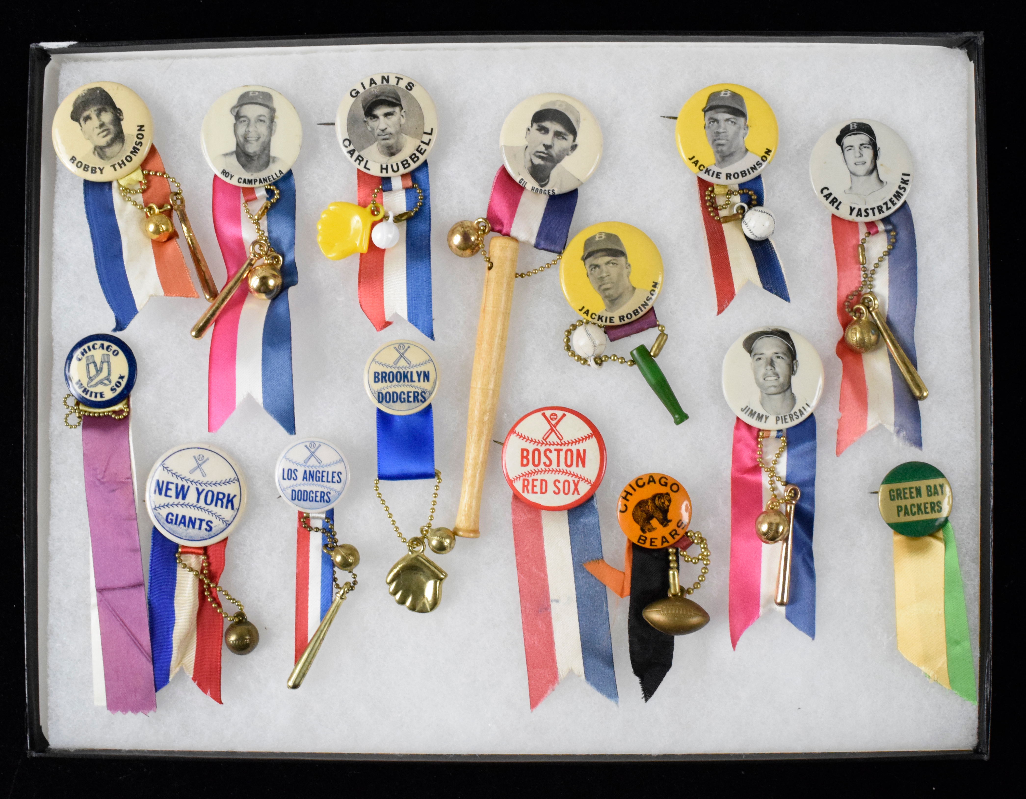 Description:Lot of (15) vintage baseball and football pins including Jackie Robinson (VG/EX-EX/MT). Includes Carl Hubbell, Gil Hodges, (2) Jackie Robinson, Roy Campanella, Carl Yastrzemski, Jimmy Piersall, Bobby Thomson, Green Bay Packers, Chicago Bears, Brooklyn Dodgers, Boston Red Sox, Chicago White Sox, New York Giants (baseball), and Los Angeles Dodgers: VG/EX-EX/MT
