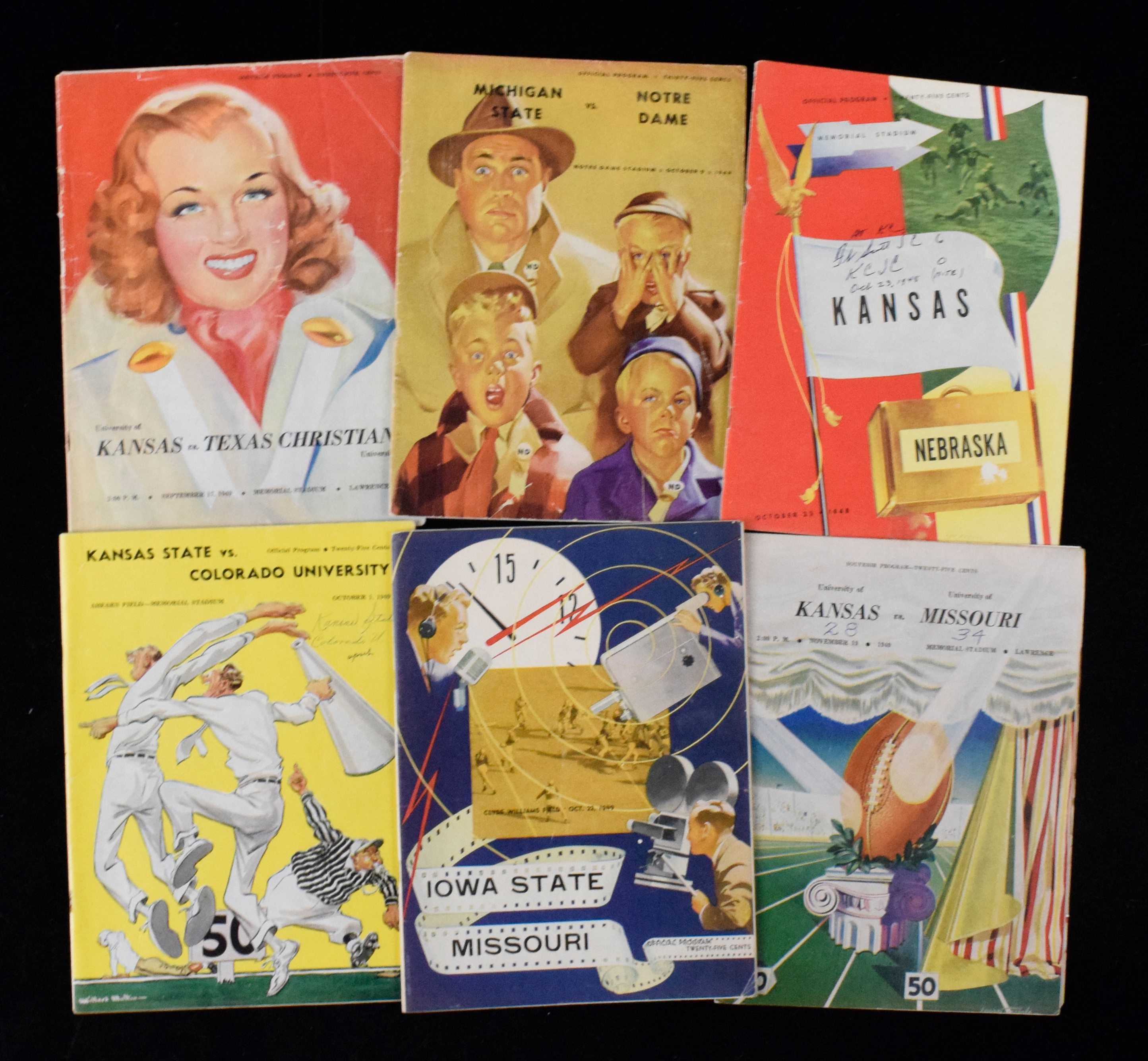 Description:Lot of (22) college football programs from 1948-1952 (GD-EX/MT). Includes 10/9/1948 Michigan State at Notre Dame, 10/23/1948 Nebraska at Kansas, 10/30/1948 Tulsa at Wichita, 11/20/1948 Southwestern at Wichita, 9/17/1949 Texas Christian at Kansas (GD), (2) 9/24/1949 Miami at Wichita, 10/1/1949 Colorado at Kansas State, 10/22/1949 Missouri at Iowa State, 10/22/1949 Kansas at Oklahoma A&M, 11/19/1949 Missouri at Kansas, 12/3/1949 Notre Dame at SMU, 10/21/1950 Oklahoma A&M at Kansas, 10/28/1950 Houston at Wichita, (2) 9/22/1951 Miami at Wichita, 9/28/1951 Wichita at Utah State, 10/6/1951 Bradley at Wichita, 10/13/1951 SMU at Notre Dame, 11/16/1951 North vs East All-Star Game, 11/1/1952 Utah State at Wichita, and 10/11/1952 Louisiana State at Kentucky. Most appear to average VG/EX overall with normal handling wear. Range: GD-EX/MT