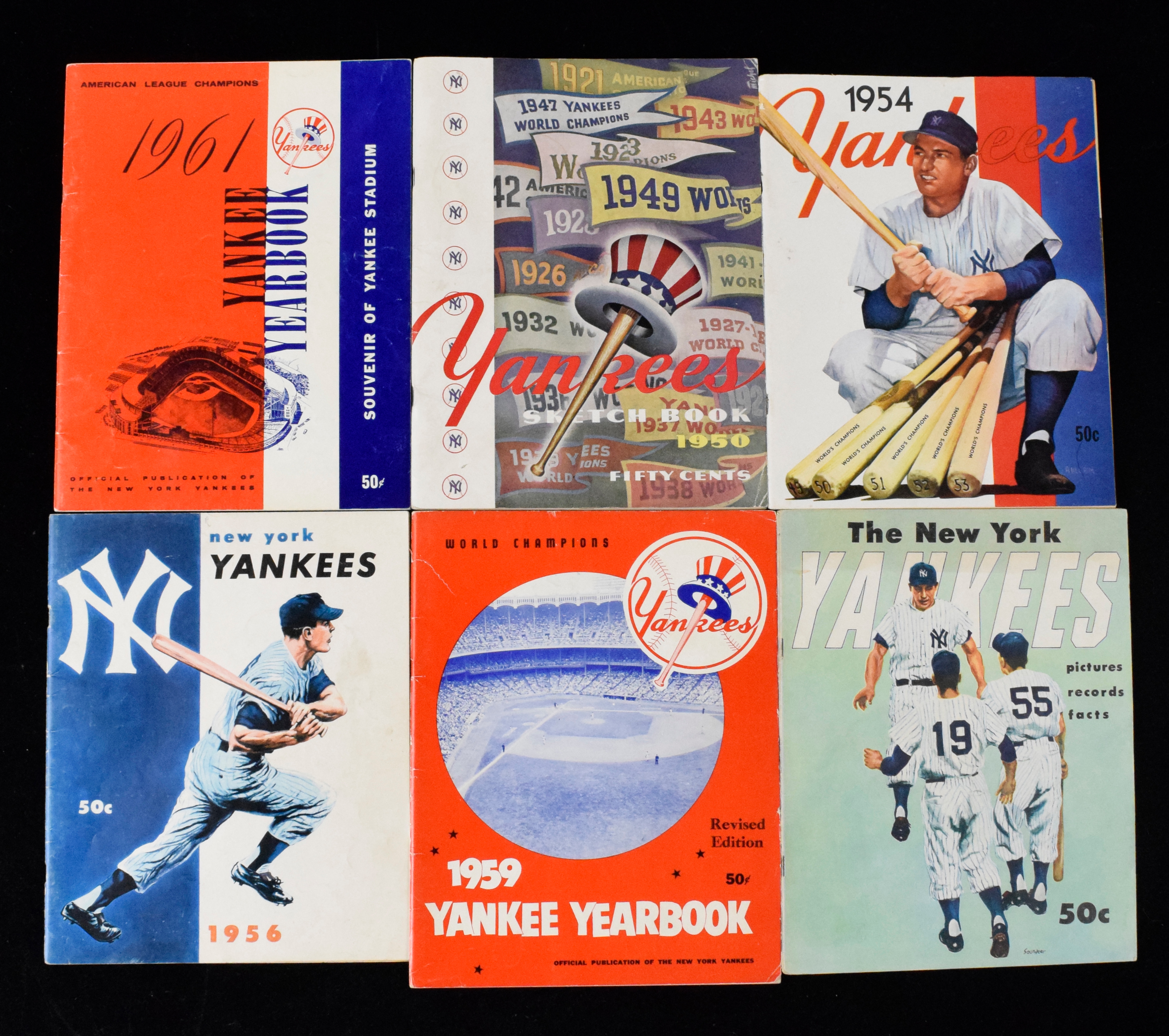 Description:Lot of (30) New York Yankees yearbooks from 1950-1999 (VG-NM/MT). Includes 1950, 1954, 1955, 1956, 1959 revised, (2) 1961, 1961 revised, (2) 1963 revised, 1966 revised, (2) 1967 revised, 1981, 1982, 1984, 1987, (2) 1988, 1989, 1990, 1991, 1992, 1993, 1994, 1995, 1996, 1997, 1998, and 1999. Most appear to average EX overall. Range: VG-NM/MT